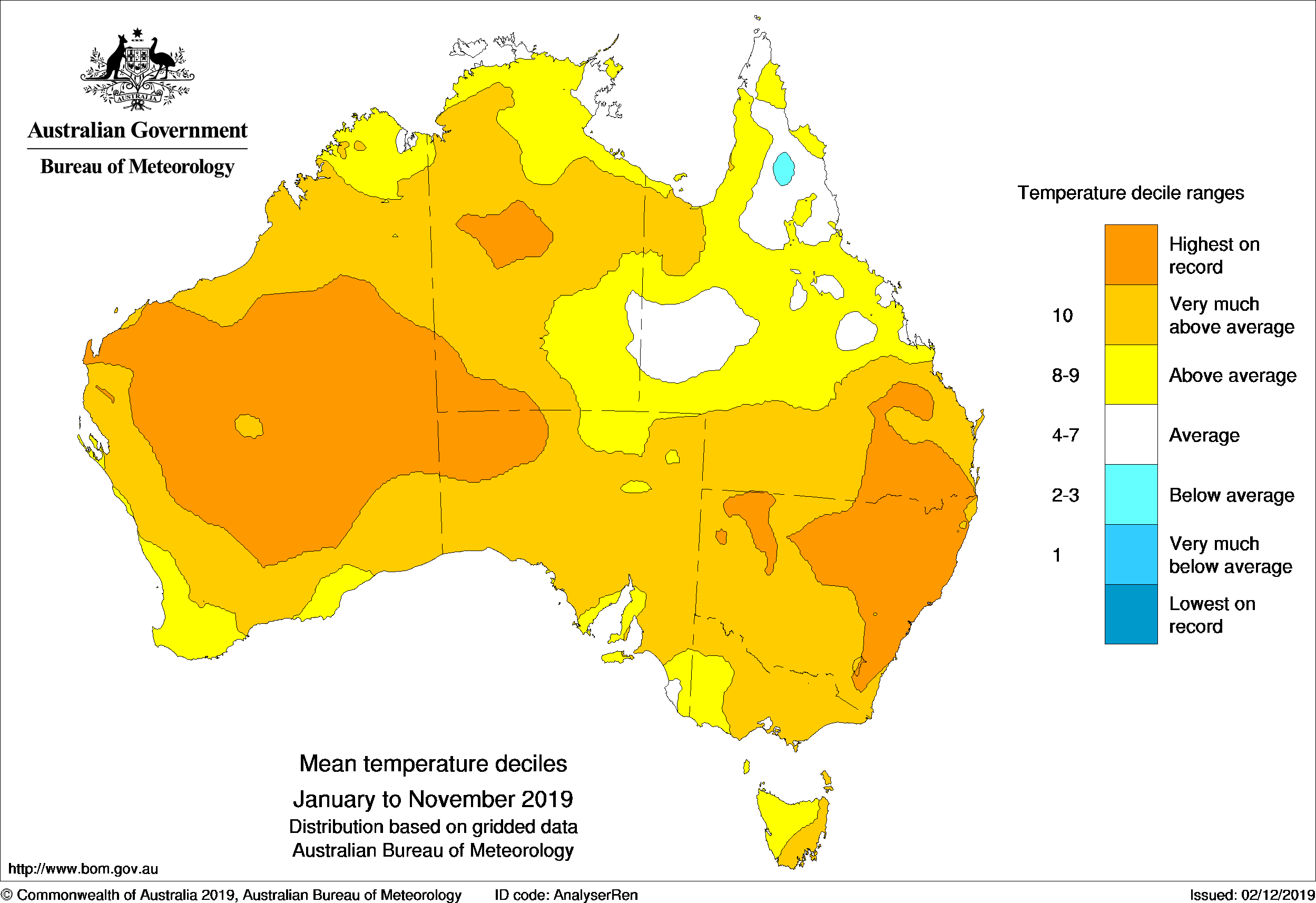Australia's mean temperature over January to November has been the highest on record for large areas of eastern and northern New South Wales, extending into southeastern Queensland, and for a large area extending from the Pilbara coast in Western Australia to northwest South Australia. January–November was the warmest on record for just over one quarter of the country, and very much warmer than average for the remainder outside of areas of western and northern Queensland.
