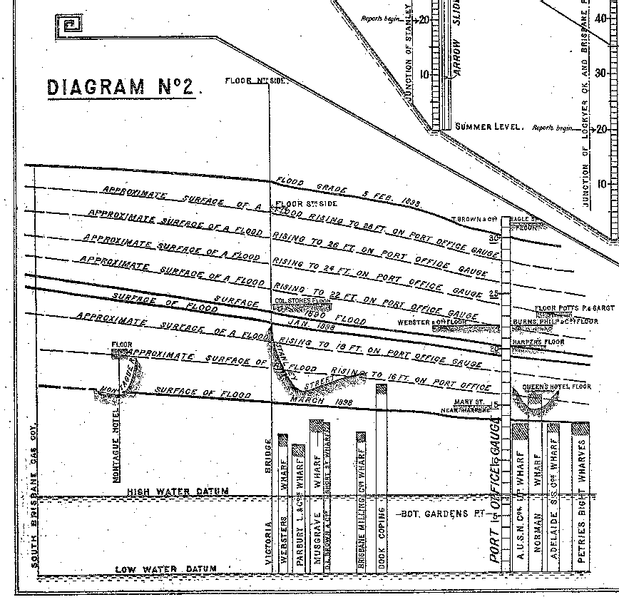 THE BRISBANE FLOOD NOTICE BOARD.Extract from: Results of Rainfall Observations made in Queensland, H.A. Hunt, Commonwealth Meteorologist, 1914.By G. G. Bond, Divisional Officer, Brisbane.24th January, 1911A Notice Board for giving information to the general public of the rise and fall of flood waters at the various flood warning stations on the Brisbane River and tributaries has been erected under the clock tower of the General Post Office at the main Queen-street entrance by courtesy of the Deputy Postmaster-General. A careful scrutiny of the new board will reveal its essential features. The design was adopted from a diagram prepared and issued by the Hydraulic Engineer some years prior to the transfer of the Flood Warning Scheme, with the Queensland Weather Bureau, to the Federal Government, and consists of two diagrams. Diagram No.1 gives representations of the river gauges at the Flood Warning Stations in the Brisbane basin, viz., Woodford (at the head of the Stanley River), Caboonbah (on the Brisbane River, just below its junction with the Stanley River), Lowood (below the junction of Lockyer Creek), Ipswich Pumping Station, Goodna (below the junction of the Bremer River), and Brisbane (Port Office gauge). The heights of all the floods about which accurate information is available are clearly shown by means of black lines connecting the various gauges. The most important feature of the Board is the metal slide which has been affixed to the right-hand side of each river gauge. An arrow, fitted with springs to maintain it at any desired position, and painted bright green, works up and down on each slide, being at the same time moveable on an axis. The purpose of the arrows is obvious, namely, to indicate the height of the water on each gauge-pointing upwards to the figures if rising, downwards if falling, and horizontally if stationary. An additional arrow, painted bright red, will be used on the Port Office gauge-slide to indicate (when sufficient information is available to warrant an opinion) the approximate height to which the flood waters are expected to rise in Brisbane. The danger level is marked on the diagram in red against each station. When the flood-warning officer at, say, Woodford reports to the station next below that the water has reached 22 feet on the Woodford gauge, i.e., danger level at that station, and is still rising, it is the duty of the officer in charge of the flood-warning station at Esk to send out mounted messengers up and down the river to warn people resident on land liable to flooding. Similar action is taken by each successive station down the river to Goodna. Finally, the height at which each officer must begin sending flood reports to the stations below him, in accordance with his carefully framed instructions, is indicated on each gauge. Diagram No.2 is of special interest and value to merchants and others whose places of business or residence are situated below the flood mark. It shows, in the form of a longitudinal section, the relative levels of certain wharves, floors, and streets, the surfaces of observed floods, and the approximate surfaces of floods rising to different heights on the Port Office gauge. When it is expected that a flood will rise to a certain height indicated by the red arrow on the Port Office gauge, anyone whose wharf or floor is shown on the diagram can, by following back the flood surface line, ascertain whether such a flood will reach his wharf, floor, or cellar, as the case may be. It would certainly be advisable for all those who do not know the exact height of their premises above low water datum to have the level accurately ascertained by a surveyor, so that full use may be made of the facilities offered. The Notice Board has been erected in a very prominent and convenient place by the Commonwealth Meteorological Bureau at considerable expense, and, in the event of a rise in the Brisbane River, officers will be in attendance at the Weather Bureau, night and day, to receive messages from the floodwarning stations, the import of which will immediately be indicated by the green arrows. The public may therefore rest assured that the very earliest intimation of a flood in Brisbane will be afforded by the Flood Notice Board, and they are requested to bear in mind two things: (a) The instructions to flood-warning officers (mostly police officers) are very explicit, and well understood by them. (b) If no reports are received at the Weather Bureau, it may be taken for granted that the water has not reached reporting height. It is hoped that a remembrance of these two