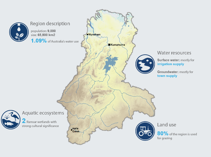 The Ord River is one of the more significant waterways in northern Australia. A distinctive feature is Lake Argyle, a Ramsar-listed wetland of international importance, which supports irrigated agriculture and hydroelectric generation in the region. Groundwater is also an important water source in the region, primarily used for mining purposes and town supply.