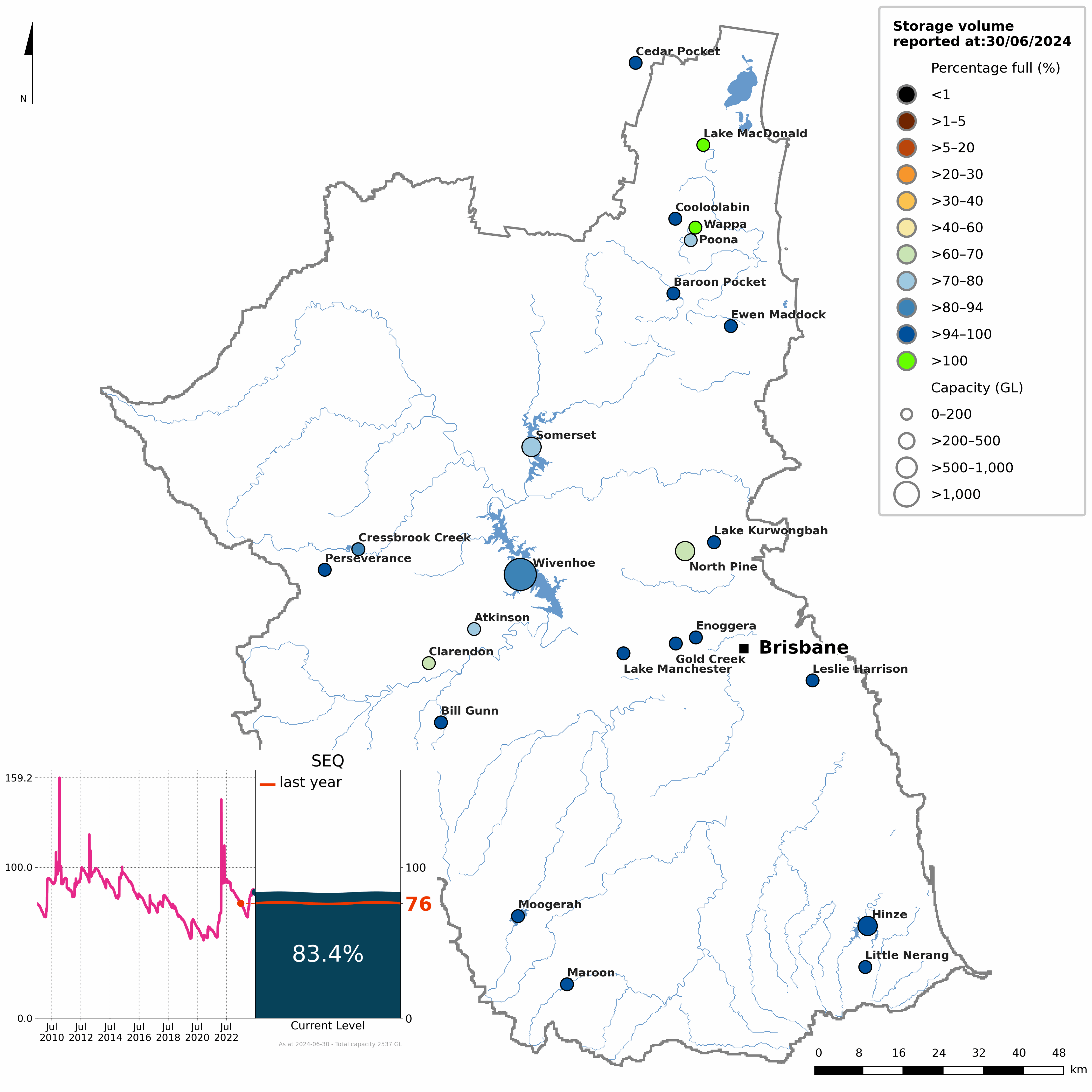 - By 30 June 2024, the total storage volume across South East Queensland was 83.4% full—up7.3% from this time last year.