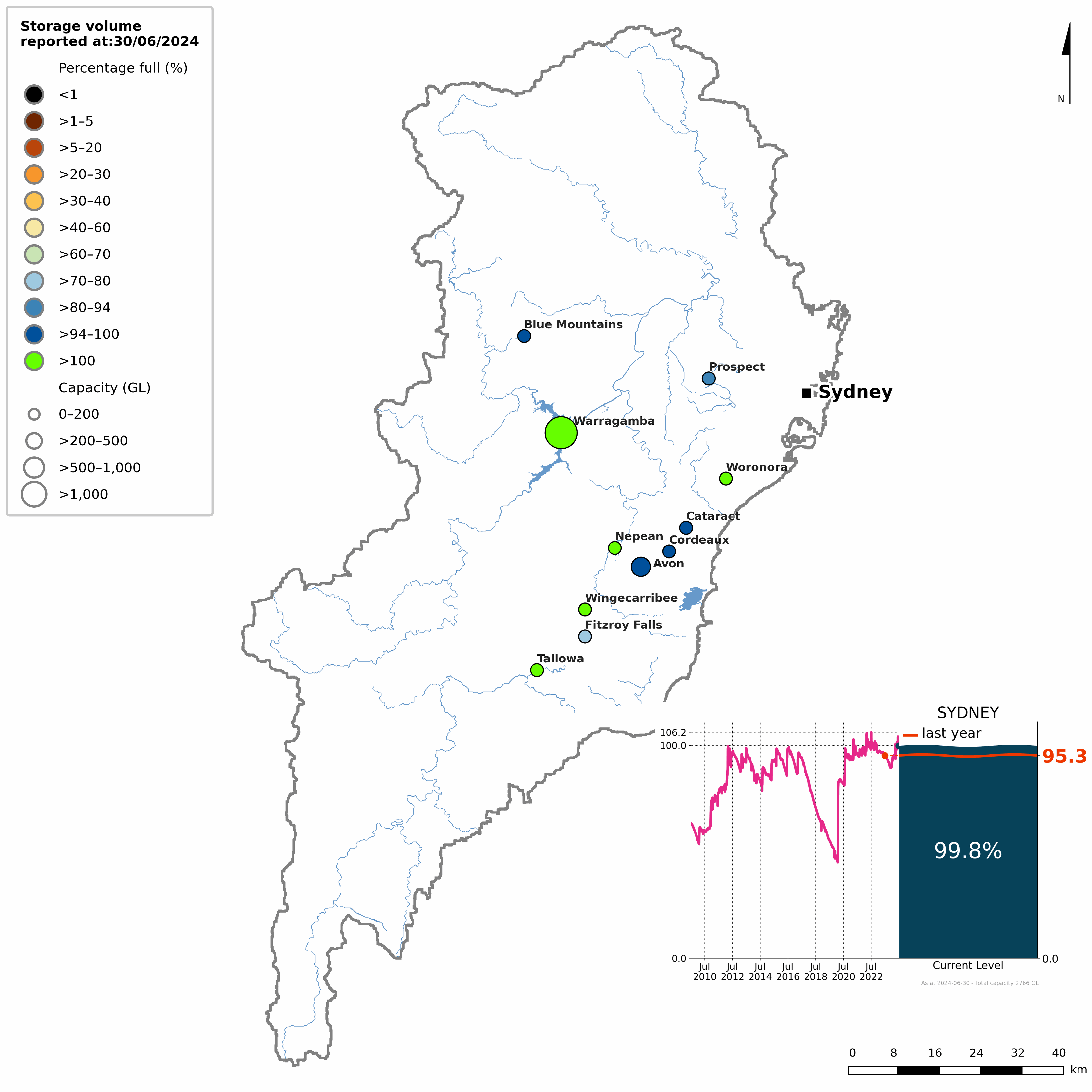 - By 30 June 2024, the total storage volume in the Sydney region was 99.8%, with several storages exceeding 100% of their full supply capacity. This was the highest end-of-year storage volume since 1988.