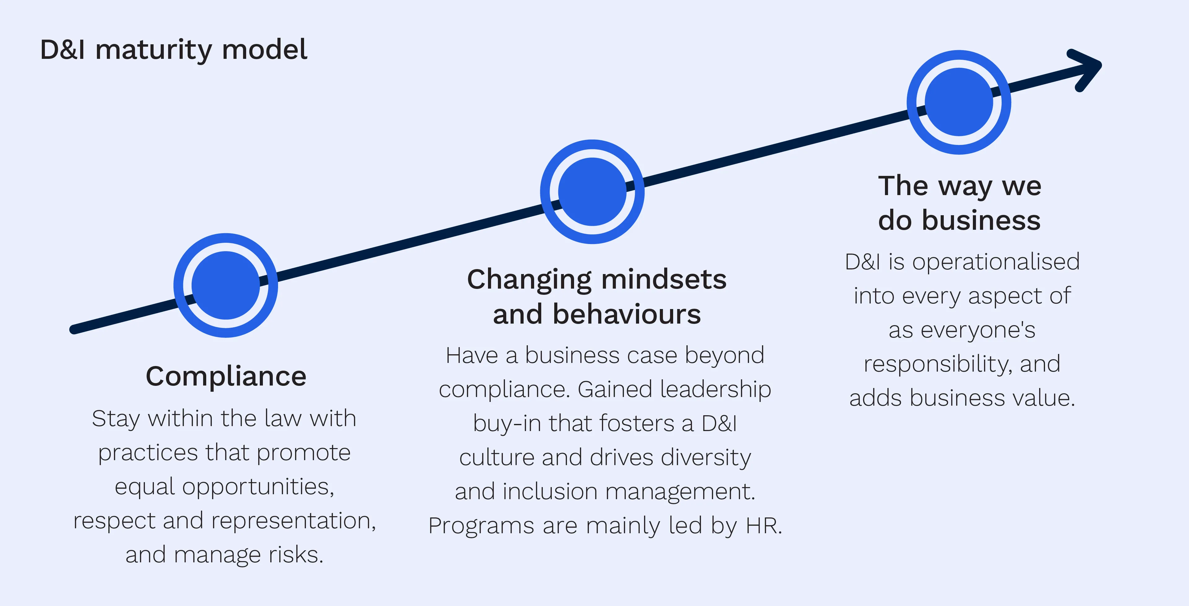 We encourage you to start by using the D&I maturity model (below) that is designed to help organisations and teams benchmark and improve their current practices, moving through stages from compliance with legal requirements to an inclusive workplace and culture.