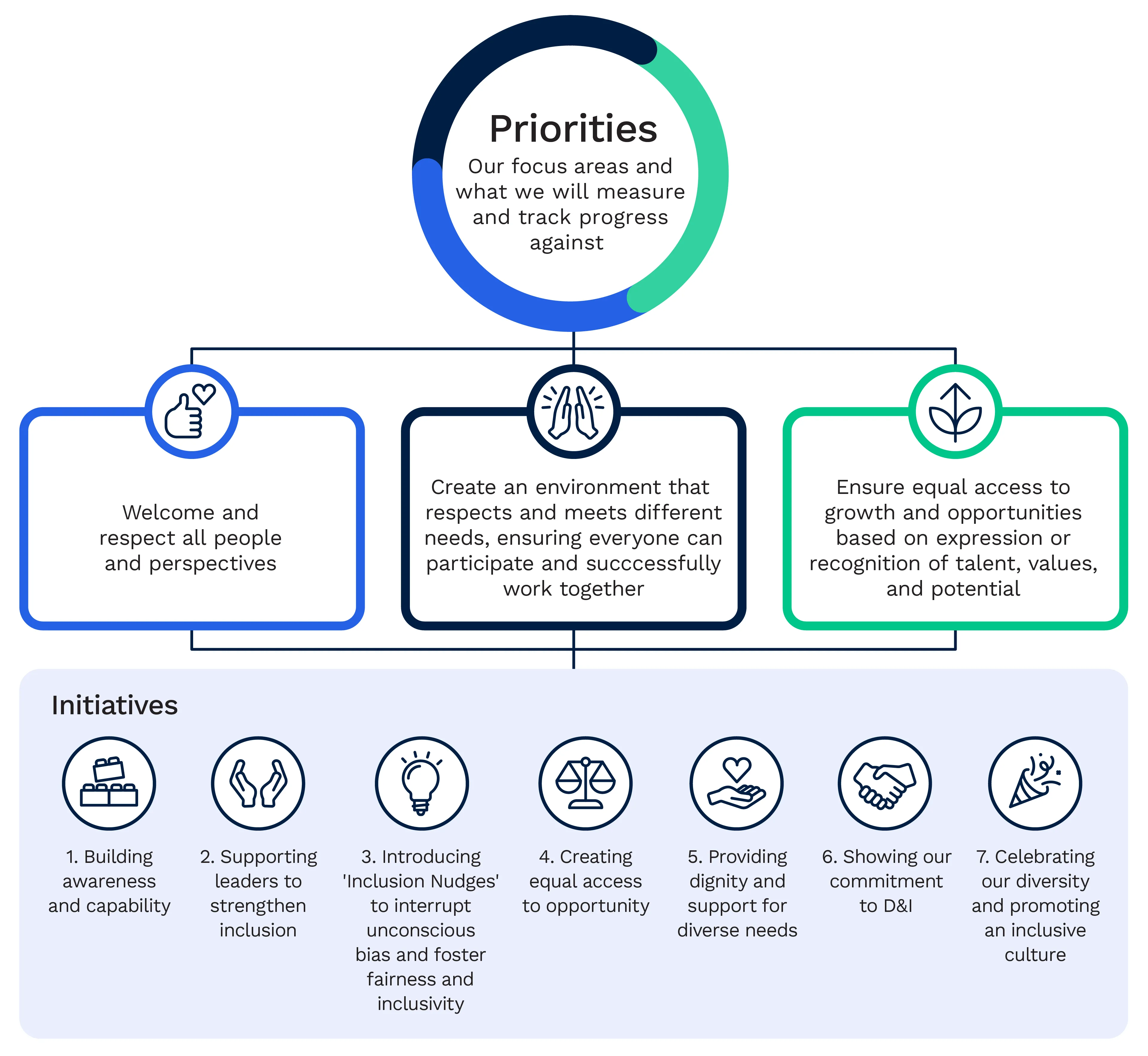 Use the priorities and initiatives below as a guide for conversations. Explore the Our action plan page and ensure focus areas are appropriate to the D&I maturity levels of the team.