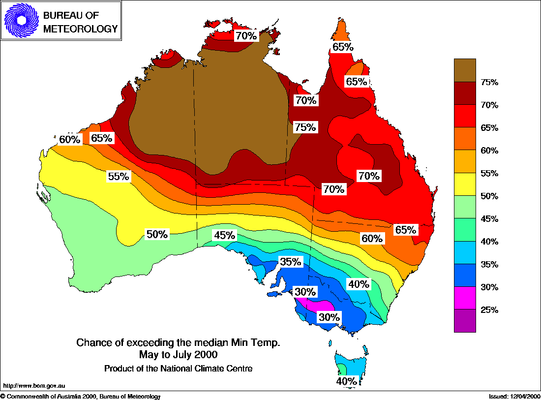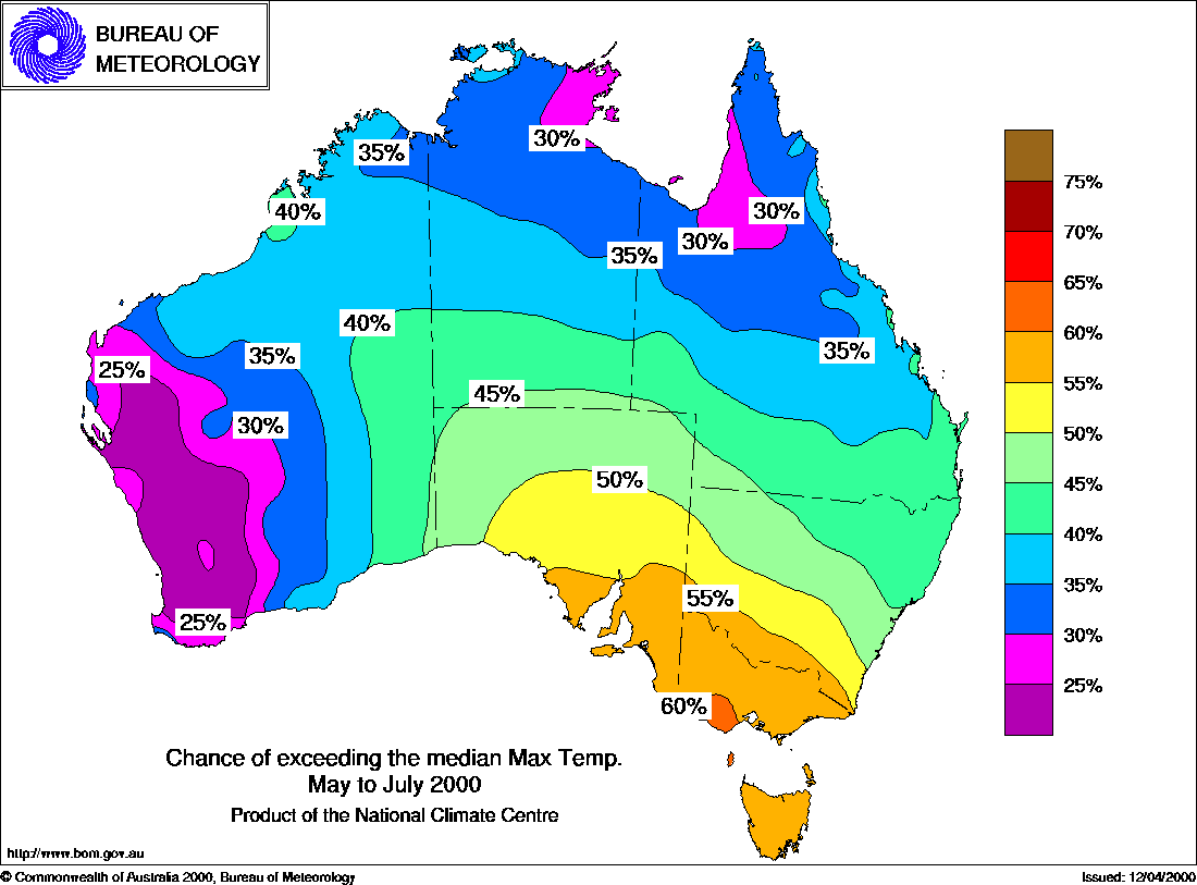 MEDIA RELEASE - ISSUED 13th APRIL 2000 Three-month Seasonal Climate Outlook Summary: Temperature probabilities for May to July 2000Cooler than average days more likely in the west and northThe seasonal temperature outlook for May - July shows that, apart from southeastern Australia, most parts of the country have only a 30 to 45% chance of above average seasonal maximum temperatures (see first map below). In other words, the probability of a cooler than normal season is around 55 to 70%. However, in Victoria, Tasmania, and the southern parts of both South Australia and N.S.W., a warmer than average season is the more likely outcome having chances of 55 to 60%. The outlook system has moderate skill or reliability in all areas except northern N.S.W. and southern Queensland for the May to July period. The picture is almost the reverse for May-July seasonal minimum temperatures. Most of northern Australia has a 60 to 70% chance of above average minima, but in the southeast of the country probabilities are mostly between 30 and 40% (see second map below). May to July seasonal minimum temperature forecasts have moderate to high skill or reliability in all areas except the southeast of the country and the southern half of South Australia. Background Information: