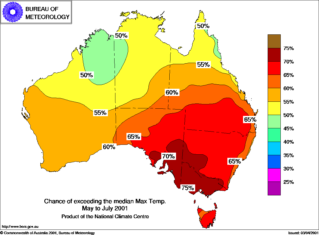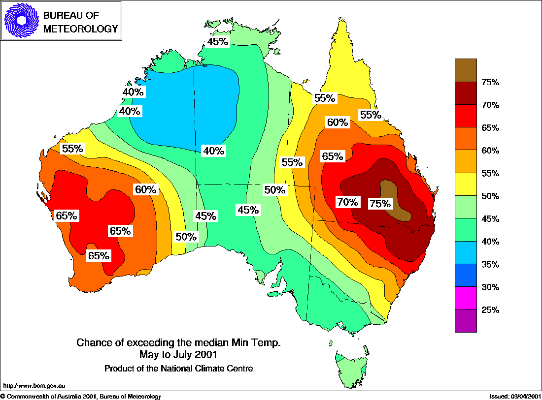 MEDIA RELEASE - ISSUED 19th April 2001 Three-month Seasonal Climate Outlook Summary: Temperature probabilities for May to July 2001Warmer days favoured in east and southThe National Climate Centre's seasonal temperature outlook shows an increased likelihood for a warmer than average season across much of eastern and southern Australia. In NSW, southern Queensland, Victoria, Tasmania and S. A., the chances of above average seasonal maximum temperatures for the May to July period are about 60 to 70%, nearing 75% in parts of Victoria (see first map below). This means that in years with climate patterns like the current, about 6 or 7 out of every 10 are warmer than the long-term May-July median, whilst about 3 or 4 out of 10 are cooler. In addition, the outlook skill is moderately high in Victoria, Tasmania and southeast S. A. for this particular season. In other areas, the outlook chances are close to the baseline level of 50%. The outlook for seasonal minimum temperatures points to warmer than average nights in Queensland, northern NSW and southern W. A. The probabilities in these areas are mostly in the 60 to 75% range (see second map below), and the skill is moderate to high. Conversely, cooler than average nights are more likely in parts of the Kimberley in W. A. and adjacent regions of western N. T.