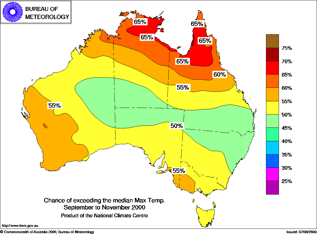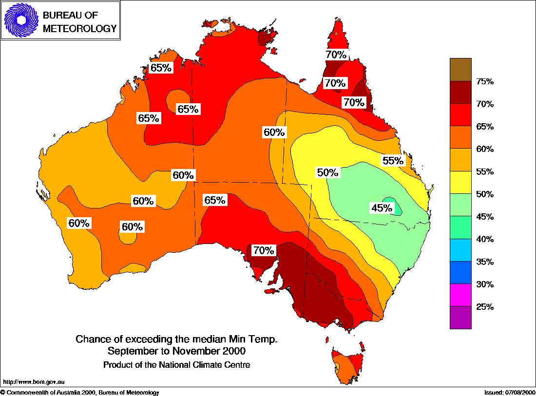 MEDIA RELEASE - ISSUED 15th AUGUST 2000 Three-month Seasonal Climate Outlook Summary: Temperature probabilities for Spring (Sep - Nov) 2000Odds favour warm spring in the tropicsThe National Climate Centre's seasonal temperature outlook for spring shows increased chances for above average seasonal maximum temperatures across much of the country, but particularly in the tropical north. The probabilities reach 60 to 70% there (see first map below), but chances are also above 55% in western W.A. and parts of southeast Australia. The chances are close to 50% elsewhere. At this time of year, the maximum temperature outlooks have moderate skill or reliability over Queensland, northern NSW and eastern N.T., but lower skill in the west and southeast. The outlook for seasonal minimum temperatures is shown in the second map. As with maximum temperatures, the odds favour warmer than average conditions over much of the nation. The exception is in southern Queensland and northern NSW where a cooler than average season is marginally more likely. For spring, seasonal minimum temperature forecasts show moderate skill in most areas apart from Tasmania, southeast Queensland, and the east of both NSW and Victoria. Background Information: