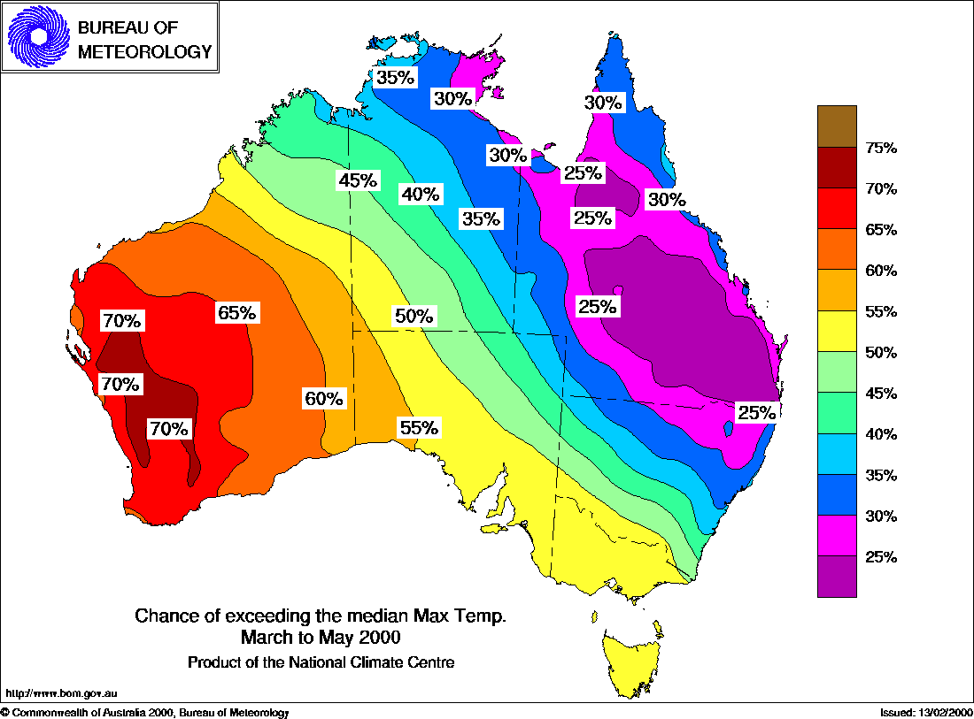 MEDIA RELEASE - ISSUED 16th February 2000 Three-month Seasonal Climate Outlook Summary: Temperature probabilities for Autumn 2000 (March to May)Bureau of Meteorology issues first seasonal temperature outlookAfter a decade of seasonal rainfall outlooks, the Bureau of Meteorology has added seasonal temperature outlooks to its service. Temperature outlooks have potential applications in such areas as bushfire control, water and electricity supply, as well as cropping and grazing. Importantly, they are for the average maximum and minimum temperatures for the entire outlook period. Information about individual days or weeks, which may be unusually hot or cold, is not given in the outlooks. This first seasonal temperature outlook from the National Climate Centre shows that for a large area of northern and eastern Australia, there is only a 25% to 35% chance that daily maximum temperatures averaged over autumn will be above normal - see first map below. In contrast, through the west of Western Australia the chances of maximum temperatures being above average over the autumn months as a whole are mostly between 65 and 75%. For autumn however, while the outlook system has moderate to high skill in the north of both the N.T. and Queensland, skill is low elsewhere. This pattern of probabilities is due mostly to the presence of abnormally warm water in the Indian Ocean, particularly west and southwest of Western Australia. It is also consistent with the seasonal rainfall outlook issued earlier today which shows increased chances of above average rainfall in Queensland and below average rainfall in western W.A. There is a 70 to 80% chance that autumn minimum temperatures in Queensland and northern NSW will be above average - see second map below. The chances are also near 70% in the south and west of W.A. Background Information: