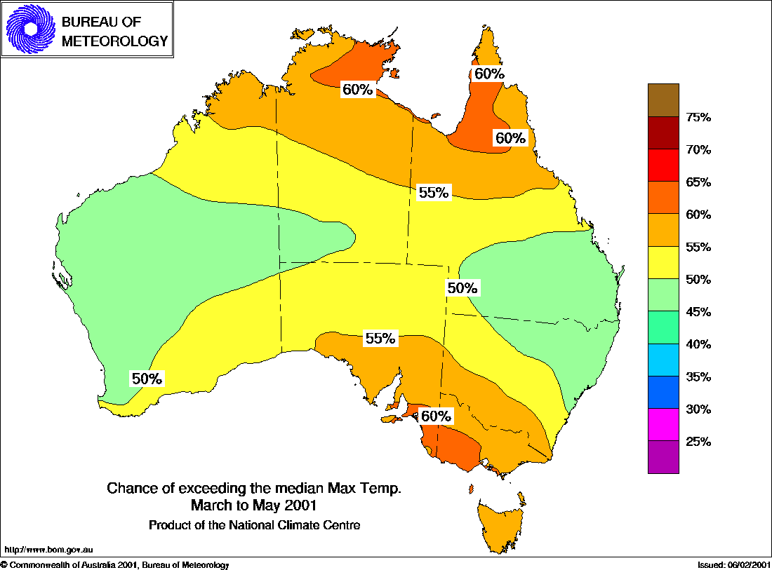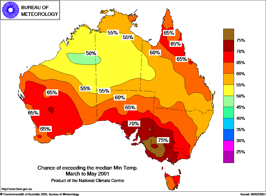 MEDIA RELEASE - ISSUED 14th February 2001 Three-month Seasonal Climate Outlook Summary: Temperature probabilities for Autumn 2001Warmer in north and southeastThe National Climate Centre's seasonal temperature outlook shows that the above average temperatures experienced in the southeast during Summer, stand a good chance of persisting into Autumn. In the southeast, the chances of above average seasonal maximum temperatures are about 55 to 65%, as they are also in a broad zone across northern Australia (see first map below). This means that in years with climate patterns like the current, about 6 out of every 10 are warmer than the long-term Autumn median, whilst about 4 out of 10 are cooler. The chances are about 50:50 in other parts of the country. The skill of the outlooks is moderate to high in Queensland and the north of the N.T. but low elsewhere. The outlook for seasonal minimum temperatures favours warmer than average nights across most of the country. The chances of this occurring reach 60 to 70% over the southern half of the country and also in eastern Queensland (see second map below). The outlooks have moderate skill in many parts of the country for Autumn. Background Information: