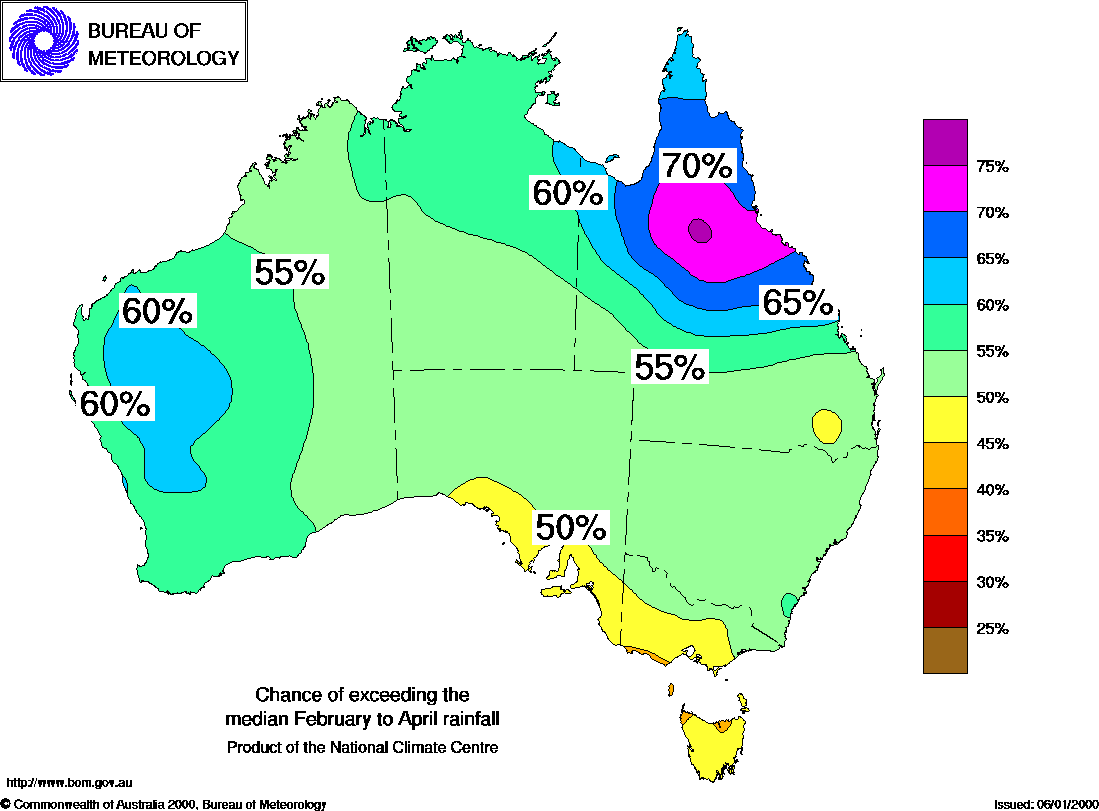 MEDIA RELEASE - ISSUED 11th JANUARY 2000 Three-month Seasonal Climate Outlook Summary: Rainfall probabilities for February to April 2000Pacific La Niņa pattern persistsThe eastern tropical Pacific Ocean continued to cool during December causing a further intensification of the Pacific La Niņa pattern. According to most computer models, this Pacific La Niņa pattern is close to maturity and should begin to weaken during the forecast period. In the past, this pattern has often, but not always, been associated with above average rainfall in eastern and northern Australia. The National Climate Centre's latest outlook shows that for much of central and northern Queensland there is a 60% to 75% chance that rainfall will be above average during the coming season (February-April) - see map. In the central west of W.A. there is about a 60% to 65% chance of above average rainfall, but in remaining areas the probabilities are mostly close to 50%. Background Information: