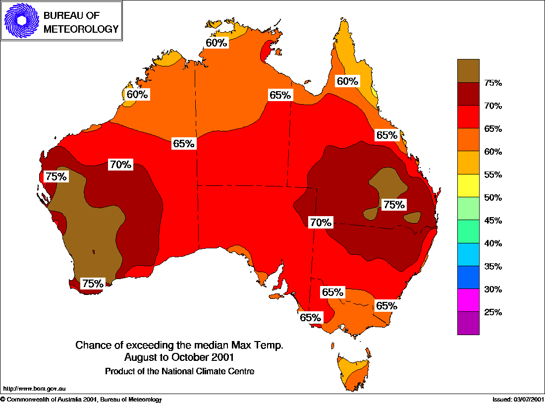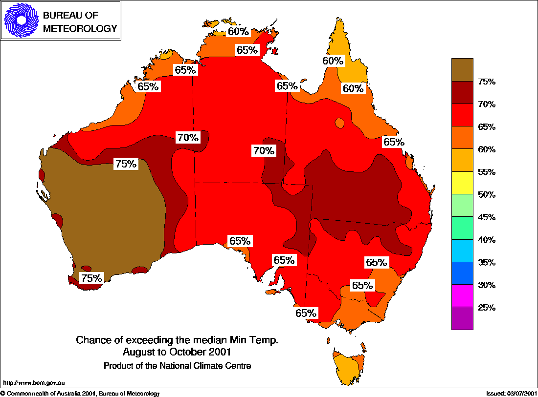 Odds on for warm winter-springThe current climate patterns favour a warmer than average August to October. The chances of above average seasonal maximum temperatures are over 60% across most of the country (see first map below), according to the National Climate Centre. Most notably, in southwest W.A. and southern Queensland, the chances are between 70 and 80%. So in years similar to the present, about 7 or 8 out of every 10 are warmer than average in these areas, whilst about 2 or 3 out of 10 are cooler. In addition, the outlook method has moderate to high skill over much of these areas. The outlook for seasonal minimum temperatures is quite similar, especially in the same parts of W.A and Queensland where the odds heavily favour warmer than average nights (see second map below). Forecast skill in southern Queensland is less than for maximum temperatures, however. Background Information: