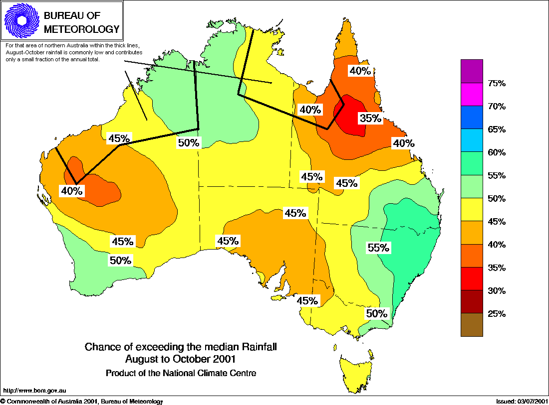 MEDIA RELEASE - ISSUED 17th July 2001 Below average falls for north QueenslandRainfall odds for August to October 2001 have shifted back towards drier conditions for northern Queensland. Chances of above average (median) falls are around 30 to 40% in this area (see map below), according to the National Climate Centre. Under this climate pattern, about 3 or 4 out of 10 seasons are expected to be wetter than usual here, whilst about 6 or 7 out of 10 are drier. In addition, the outlook scheme has moderate to high levels of skill in north Queensland. In most other parts of the country, the current ocean patterns do not strongly favour either above or below average rainfall according to the statistics used by the National Climate Centre. In other words, chances are fairly close to the baseline level of 50%. Background Information: