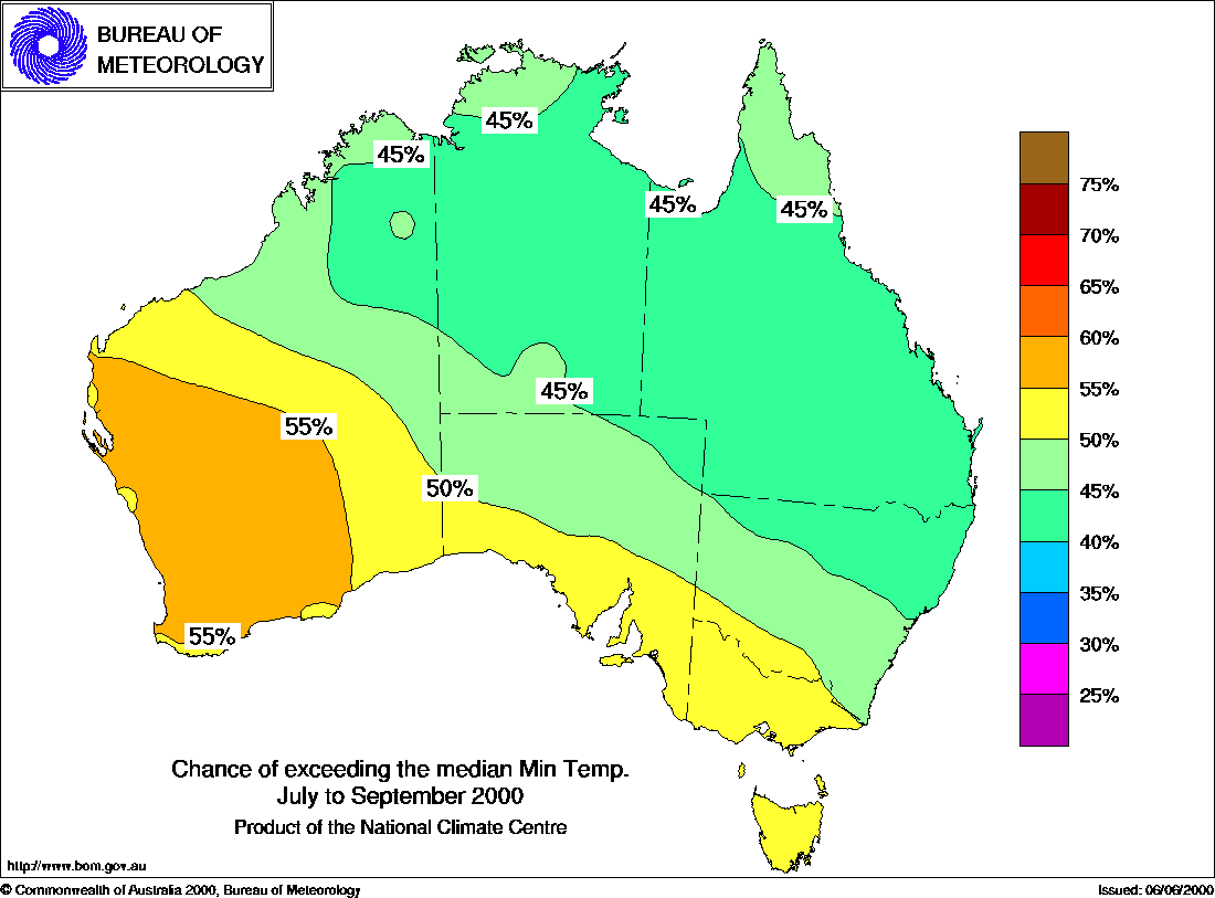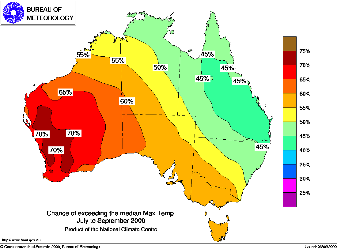 MEDIA RELEASE - ISSUED 14th JUNE 2000 Three-month Seasonal Climate Outlook Summary: Temperature probabilities for July to September 2000Odds favour warm season in the westThe seasonal temperature outlook for July to September shows increased chances for above average seasonal maximum temperatures in southern and western areas of the country. The highest probabilities occur in W.A. where they reach 60 to 70% (see first map below), but chances are also above 55% over Victoria, Tasmania, most of South Australia and the southwest of the Northern Territory. Through Queensland though, the chances are reduced - being of the order of 40 to 45%. The outlook system has moderate skill or reliability in most parts of the country for the current season, except in the southeast where it's low. The outlook for warmer seasonal minimum temperatures is shown in the second map below. As with maximum temperatures, the odds are up somewhat over southern Western Australia (55-60%), but down across many northern regions where chances range from 40 to 45%. For this season, seasonal minimum temperature forecasts show high skill in southern W.A., moderate skill in Queensland and northern N.S.W., and low reliability elsewhere. Background Information: