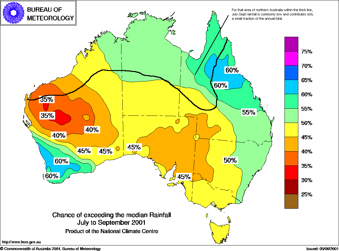 MEDIA RELEASE - ISSUED 14th June 2001 Above average falls favoured in north QueenslandRainfall odds for July to September 2001 have shifted towards wetter conditions for northern Queensland. Chances of above average (median) falls are around 60 to 65% in this area (see map below), according to the National Climate Centre. Under this climate pattern, about 6 out of 10 seasons are expected to be wetter than usual here, whilst about 4 out of 10 are drier. The outlook scheme has moderate to high levels of skill in north Queensland, but July-September is the driest time of year and heavy rain is unusual. The outlook also favours above average rainfall in southwest W.A., but this needs to be viewed cautiously because the outlook method has low skill in this area. The skill is also low for north-central W.A. where the probabilities are below 40%, implying a drier than average season. In most other parts of eastern and southern Australia the chances are close to the baseline level of 50%. Background Information:
