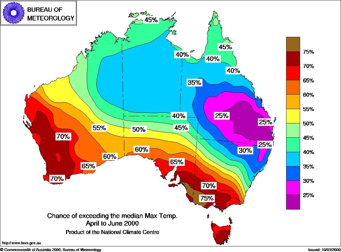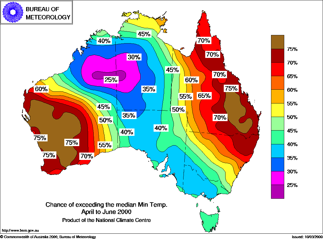MEDIA RELEASE - ISSUED 17th MARCH 2000 Three-month Seasonal Climate Outlook Summary: Temperature probabilities for April to June 2000Warm conditions more likely in the westThe seasonal temperature outlook for April - June shows about a 65 to 75% chance of above average seasonal maximum temperatures for the southwest of Western Australia (see first map below). The skill of the outlook system is moderate to high in this part of W.A. for this period. The forecast also suggests warmer days are more likely for southeast Australia (chances between 70 and 80%), but less likely in southern Queensland and northern N.S.W. where the probabilities are between 20 to 30%. However, the outlook skill is generally low in these regions requiring the probabilities to be treated with more caution. There is also a 70 to 80% chance that April-June seasonal minimum temperatures in southwest Western Australia will be above average (see second map below). Similar probabilities apply in eastern Queensland and both these areas are where minimum temperature forecasts show the most skill for the current season. In contrast, the chances of above average minimum temperatures are only 20 to 30% in the W.A./N.T. border region, although there is little useful skill in this region for this period. Background Information: