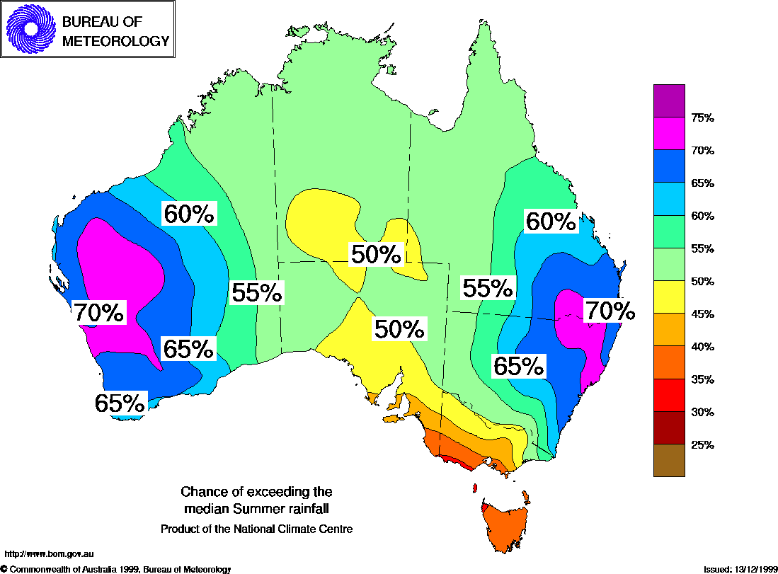 MEDIA RELEASE - ISSUED 11th NOVEMBER 1999 Three-month Seasonal Climate Outlook Summary: Rainfall probabilities for Summer 1999/2000 (Dec-Feb)Increased chances of above median rainfall in west & eastThe National Climate Centre's latest outlook shows that for much of New South Wales, southeast Queensland and the west of Western Australia, there is a 60% to 75% chance that summer rainfall will exceed the median (see map below). In those parts of New South Wales and Queensland where heavy rain has fallen recently, this outlook suggests the possibility of further flooding. However, the shaded areas of W.A. experience drier and hotter summers and the flood frequency is therefore lower than in the east. In southeast Australia, below median rainfall is most likely, though the forecast skill for this period is low in these areas. There is about a 60% to 65% chance of below median summer rainfall totals (or 35% to 40% chance of above median as shown on the map) in Tasmania, the far southeast of South Australia, and western and central parts of southern Victoria. Most of these areas have been drier than normal during the past three years, so continuing below average rainfall would worsen the situation. It would also increase the fire danger. The October Southern Oscillation Index (SOI) was +9, somewhat above the zero recorded in September. The unofficial SOI for the 30 days ending 6th November is +10. Research has shown that small SOI values, such as those of recent months, point to near normal tropical cyclone numbers during the following cyclone season. Sea temperatures in the eastern tropical Pacific Ocean continued to cool during October, with the overall pattern now typical of a weak La Niña. Most of the available computer models are predicting neutral to weak La Niña conditions in the Pacific Ocean during summer and early autumn. In general, La Niña conditions increase the chances of wetter than average weather in eastern and northern Australia. Indian Ocean temperatures, the other input to the outlook, are the main cause of the high probabilities in W.A. and the lower probabilities in southeastern Australia. They are warmer than average in a band stretching northwestward from the central coast of W.A. For the current season, the forecast system shows most skill in western and southern W.A. and along the east coast. More information on this outlook is available during normal office hours from 8:45am to 5:30pm (EST) Monday to Friday by contacting the following Climate Meterologists in the National Climate Centre: