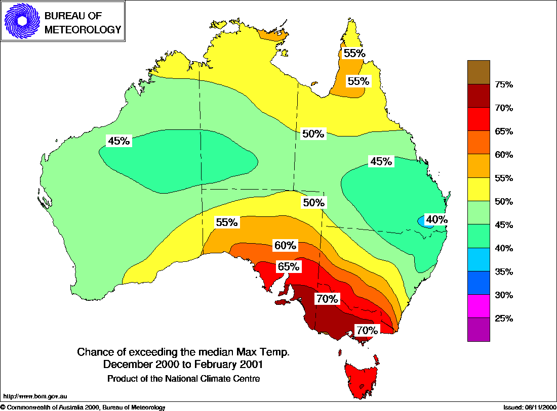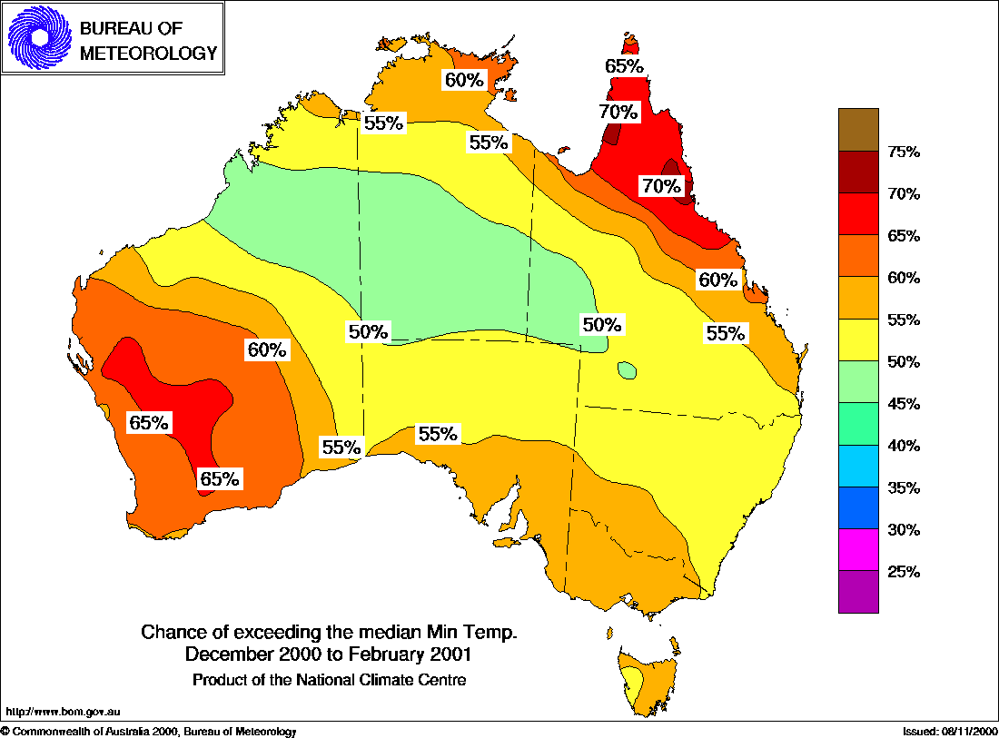 MEDIA RELEASE - ISSUED 15th NOVEMBER 2000 Three-month Seasonal Climate Outlook Summary: Temperature probabilities for Summer 2000/01 (Dec to Feb)Warm summer favoured in the southThe National Climate Centre's seasonal temperature outlook for summer shows an increased likelihood of above average seasonal maximum temperatures over Victoria, Tasmania, southern NSW and much of South Australia (see first map below). The chances of a warmer than normal summer are generally around 60 to 70% in these areas. This means that if, for the sake of argument, we had the current climate patterns in another 10 summers, then in about 6 or 7 of them, maximum temperatures would be above the long-term median in these areas. In the other 3 or 4 the temperatures would be below. On a cautionary note though, the outlooks have only low to moderate skill in these regions. The highest skill for summer is in the southern half of Queensland where the probability in a few spots is around 40%. This means that a cooler than average summer is favoured here with a chance of 60%. In other parts of the country, the probabilities are close to 50% and the outlook skill is generally low. The outlook for seasonal minimum temperatures hows an increased likelihood of warmer than normal summer nights in the southern half of W.A., north and east Qld, and the north of the N.T. (see second map below). The chances in these regions are mostly in the 60 to 70% range, so 6 or 7 years out of 10 would be likely to follow this pattern. The chances are mostly close to 50% in other areas. Background Information: