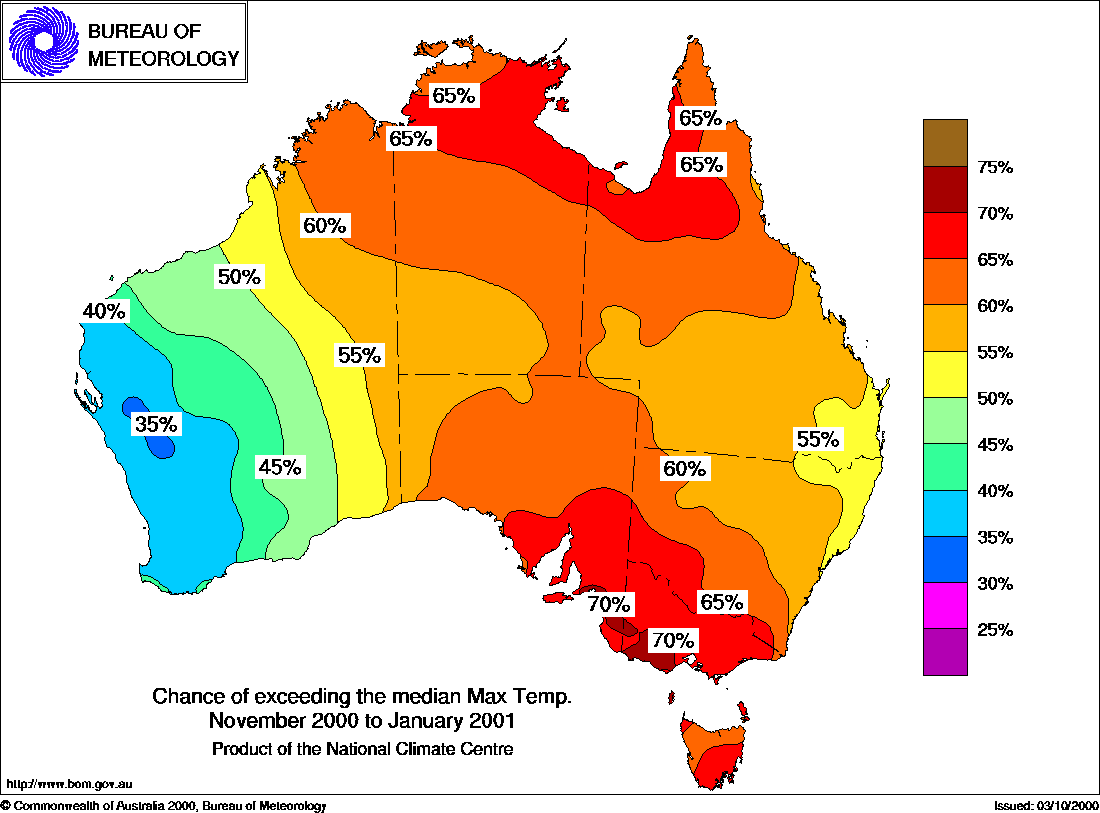 MEDIA RELEASE - ISSUED 12th OCTOBER 2000 Three-month Seasonal Climate Outlook Summary: Temperature probabilities for November 2000 to January 2001Odds favour warm season over large areasThe National Climate Centre's seasonal temperature outlook for November-January shows chances exceeding 60% for above average seasonal maximum temperatures over much of the eastern two-thirds of the nation. The highest probabilities of around 70% occur in the southeast (see first map below). The outlooks have moderate skill in the eastern states and S.A. and in the east of the N.T. at this time of year, but generally low skill in areas further west. The chances of warmer than average maximum temperatures gradually drop further below 50% approaching the west coast of W.A., reaching about 35% at their lowest. This implies a cooler than average season is the more likely outcome in the west of W.A. The outlook for seasonal minimum temperatures is very similar to the maximum temperature outlook. In other words, the odds favour warmer than average nights in eastern and central areas, but cooler than average in the far west (see second map below). The highest values of 70 to 75% occur in both the southeast of the country and north Queensland. In contrast the probabilities are about 35 to 40% in the west of W.A. The outlook skill for minimum temperatures is moderate to high in most areas. Background Information: