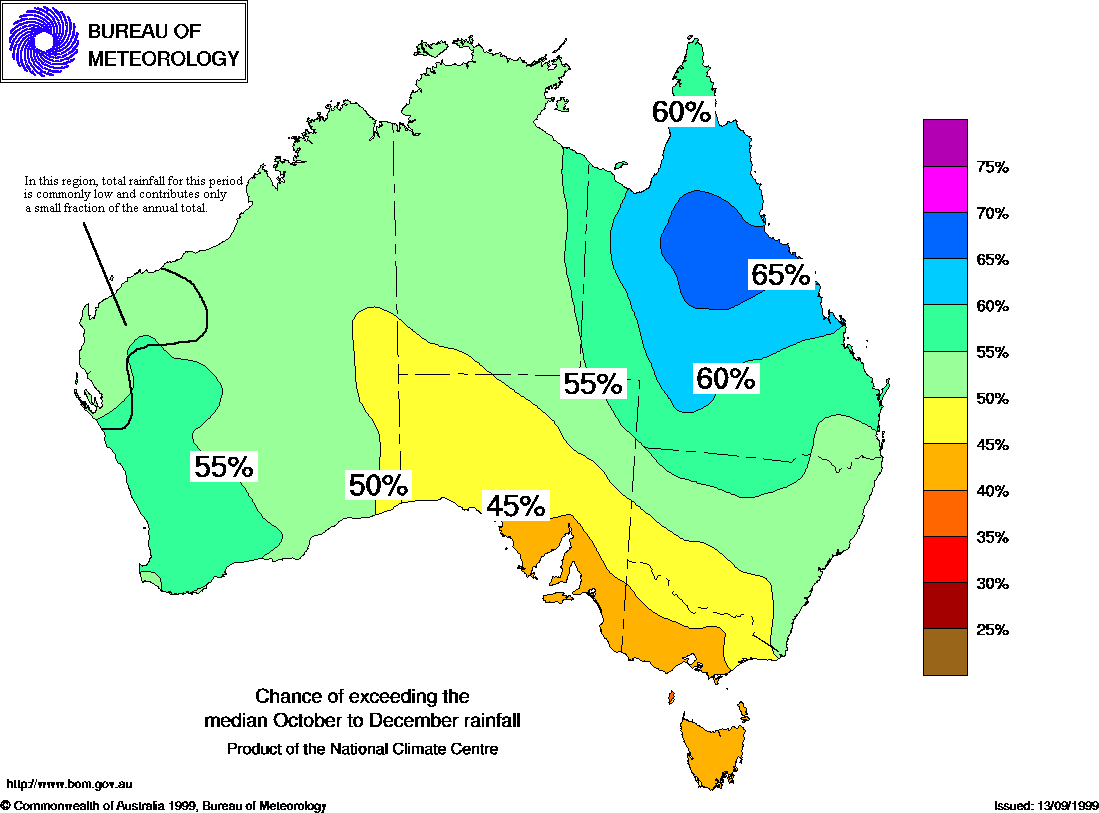 MEDIA RELEASE - ISSUED 15th SEPTEMBER 1999 Three-month Seasonal Climate Outlook Summary: Rainfall probabilities for October to December 1999Above median rainfall favoured in central and northern QueenslandThe National Climate Centre's latest outlook shows that for most of central and northern Queensland, the chance of rainfall exceeding the median for the three month period October to December is between 60% and 70% (see map below). These probabilities imply an increased chance of an active start to the wet season. In southeast South Australia, central and western Victoria, and Tasmania, the chances of exceeding median seasonal rainfall are between 40% and 45%. Or in other words, there is about a 55 to 60% chance of below median rainfall for these areas during the October to December period. Drier than normal weather during the rest of the year would aggravate existing rainfall deficiencies in the southern mainland and eastern Tasmania. Elsewhere in the country, the chances are between 45% and 55%, rising to between 55% and 60% in the southwest of Western Australia and the rest of Queensland. Sea temperatures in the tropical Pacific Ocean have cooled slightly in the last month, and are heading towards weak La Niña conditions. The August Southern Oscillation Index (SOI) stayed in small positive values at +2 (July +5). The unofficial SOI for the 30 days ending 11th September is +2. Slightly less than half the available computer models are predicting some re-development of La Niña conditions in the Pacific Ocean during the next six months. The rest are predicting a continuation of neutral conditions. No model is predicting La Niña's opposite, El Niño. In general, La Niña conditions increase the chance of wetter than average weather in eastern and northern Australia. Indian Ocean temperatures, the other input to the outlook, are currently warmer than average, increasing the chances of above median rainfall in southwestern WA. For the current season, the forecast system shows most skill in central and northern Queensland. For more information regarding this outlook please contact the following climate meteorologists in the National Climate Centre during normal office hours from 8:45am to 5:30pm (EST) Monday to Friday: Grant Beard on (03) 9669 4527 Archive of previous Seasonal Climate Outlooks August 1999 rainfall - Decile Distribution. Winter 1999 rainfall - Decile Distribution. |