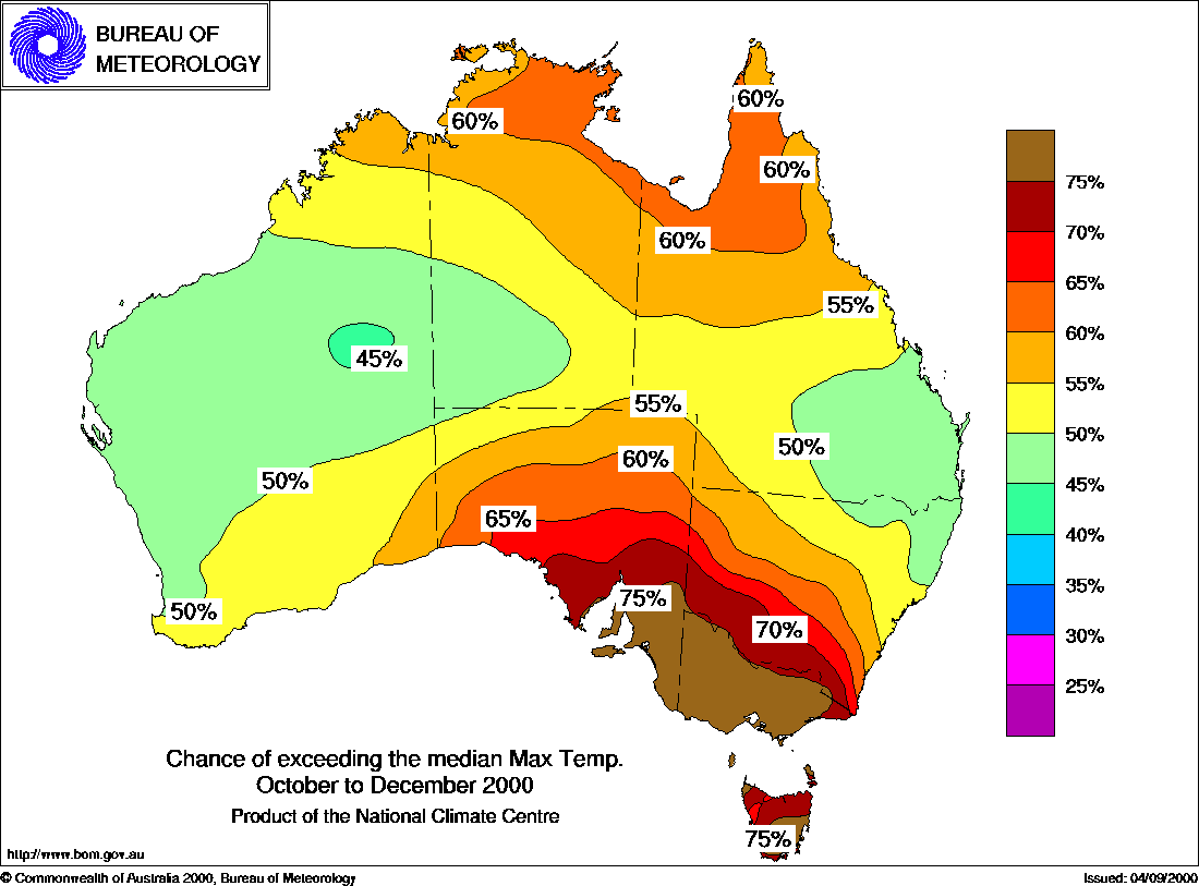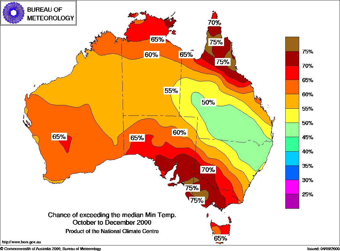 MEDIA RELEASE - ISSUED 14th SEPTEMBER 2000 Three-month Seasonal Climate Outlook Summary: Temperature probabilities for October to December 2000Odds favour warm season in north & southeastThe National Climate Centre's seasonal temperature outlook for October-December shows increased chances for above average seasonal maximum temperatures in southeast Australia, and also the far north of the country. The highest probabilities of 75 to 80% occur in the southeast (see first map below), where the outlooks are most reliable for this time of year. The outlook system has modest skill in most other parts. The chances are also above 60% in the northern tropics, but across W.A., central Australia, southeast Queensland and northern NSW, a warmer than average season is about a 50:50 prospect. The outlook for seasonal minimum temperatures shows that increased probabilities are widespread across the country (see second map below), with the highest values of 70 to 80% in the southeast and far north. In other words, the odds favour warmer than average nights over much of the nation. The exception is in southern and western Queensland and northern NSW where the probabilities are near 50%. For the Oct-Dec period, seasonal minimum temperature forecasts show moderate to high skill in most areas. For spring, seasonal minimum temperature forecasts show moderate skill in most areas apart from Tasmania, southeast Queensland, and the east of both NSW and Victoria. Background Information: