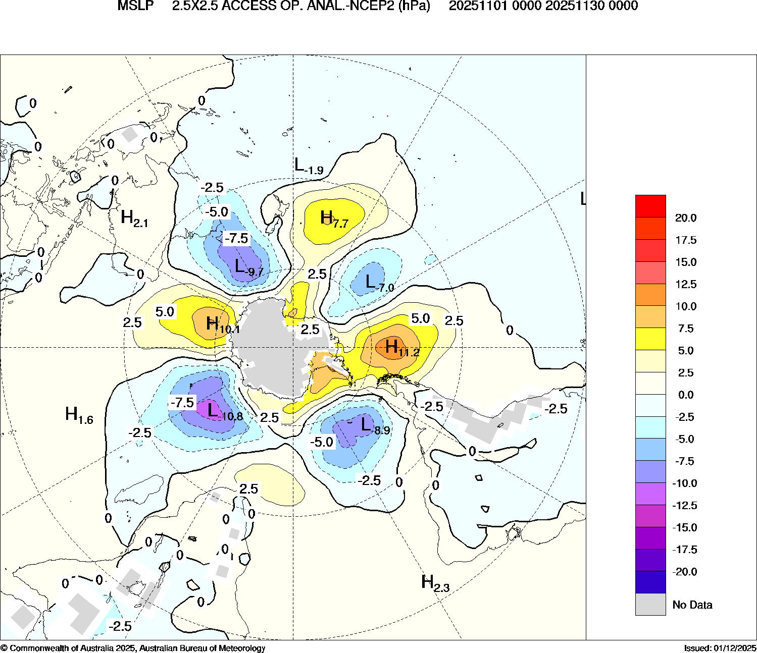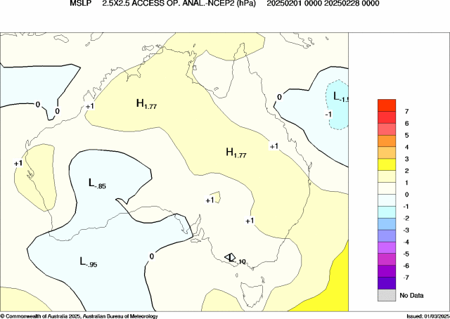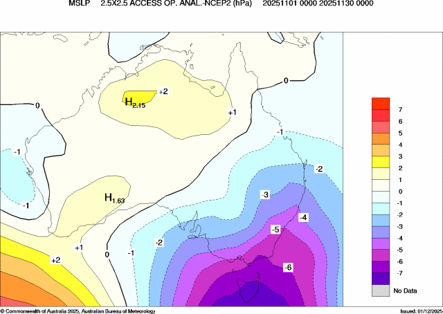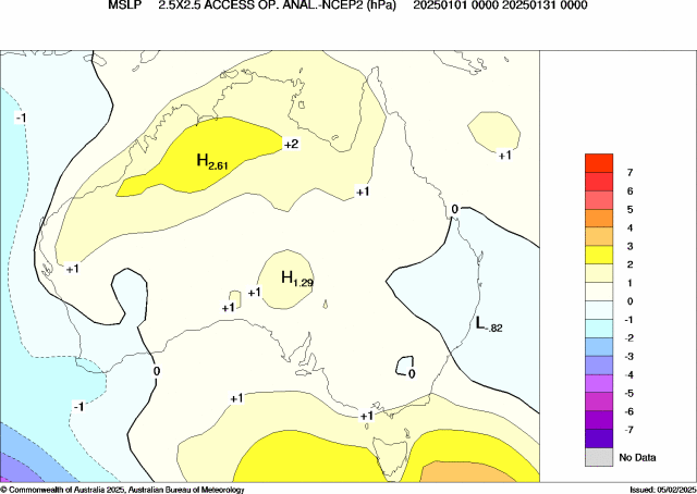 Australia's climate is influenced by global pattens in the oceans and atmosphere that can vary throughout the year. For much of 2025, mean sea level pressure (MSLP) remained predominately above average, indicating persistent high-pressure systems over Australia. This was consistent with long-term trends in MSLP associated with background global warming.