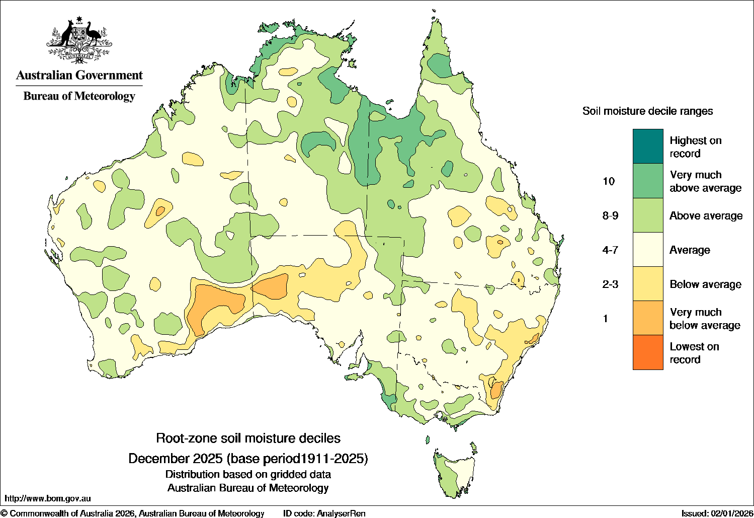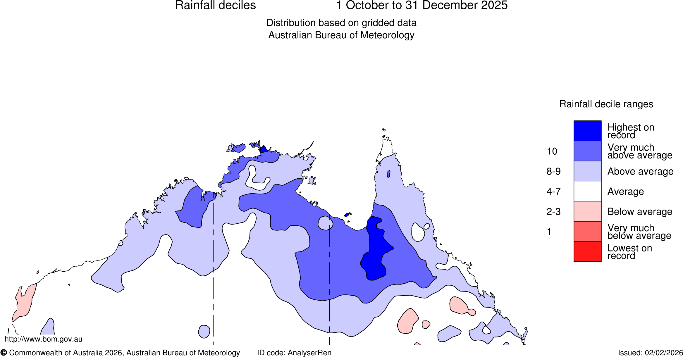 For October to December, the start of the 2025–26 northern wet season, rainfall was above to very much above average for much of Queensland, the Northern Territory and northern parts of Western Australia. The above average rainfall was mostly related to Tropical Cyclones Fina and Hayley, and the establishment of the monsoon trough from mid-December. Parts of north-western Queensland had their highest on record October to December rainfall.