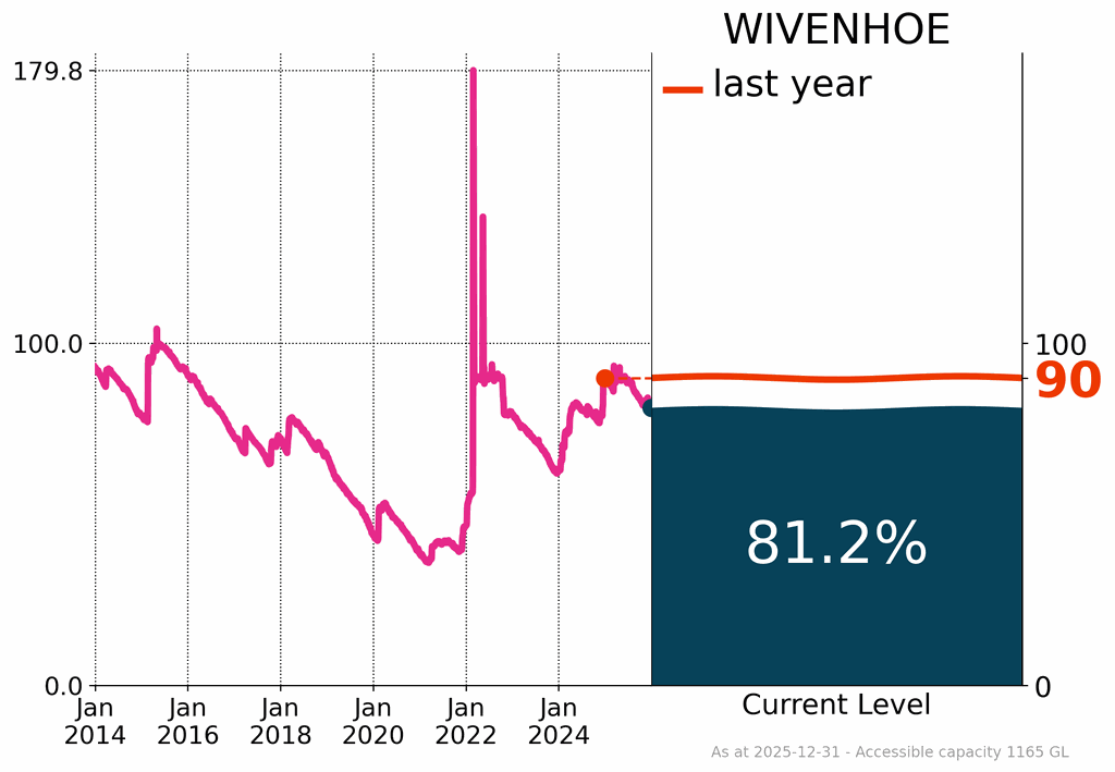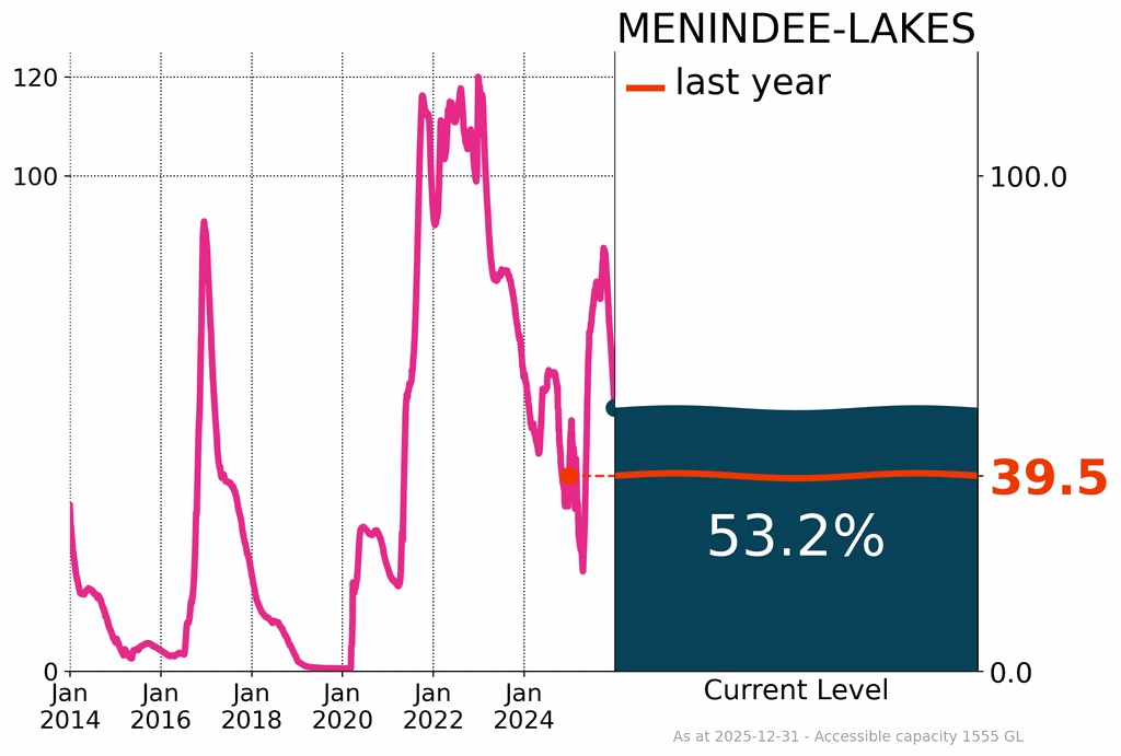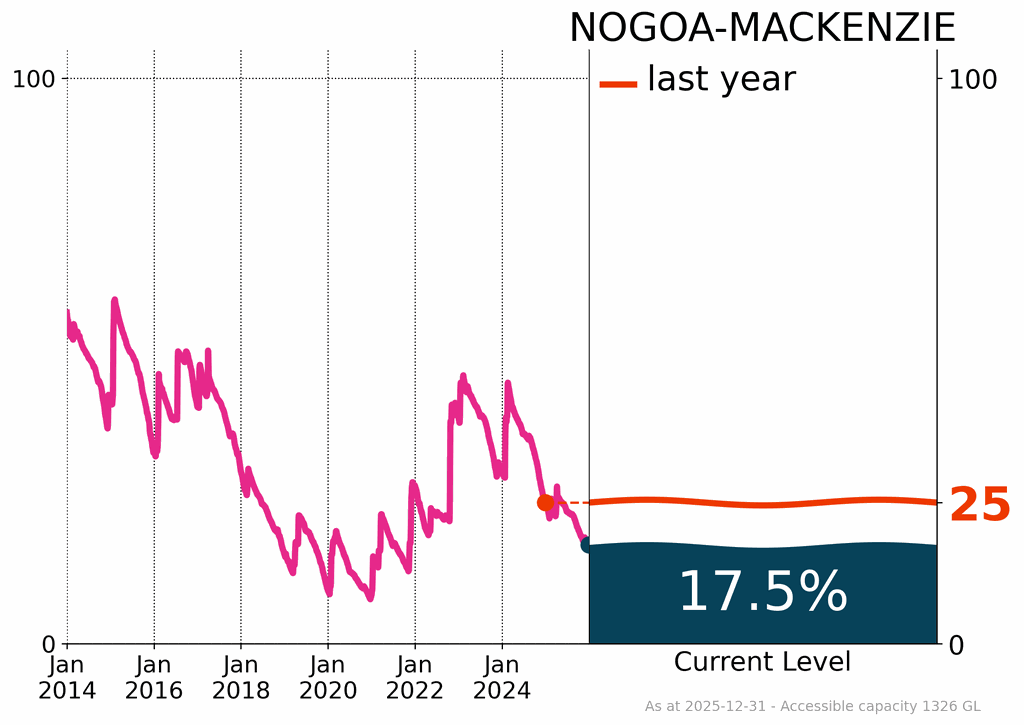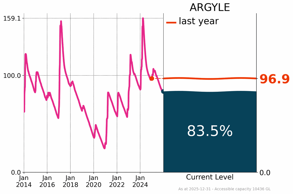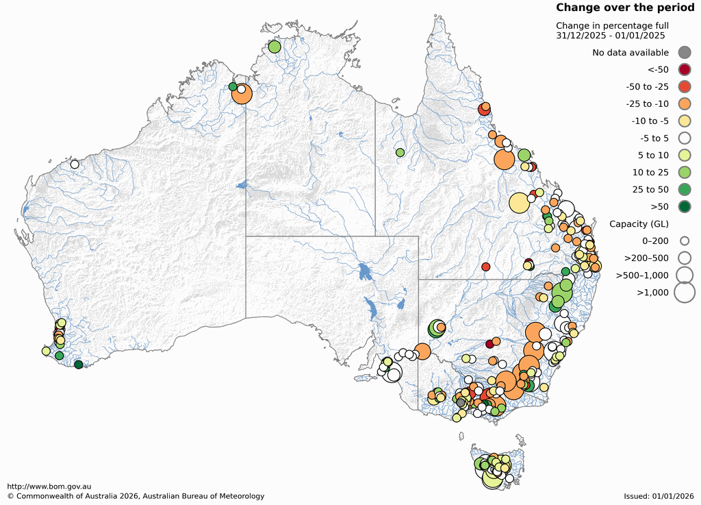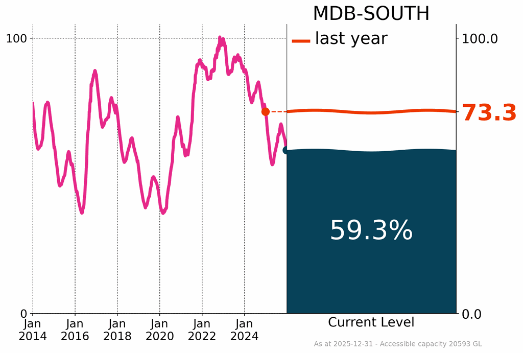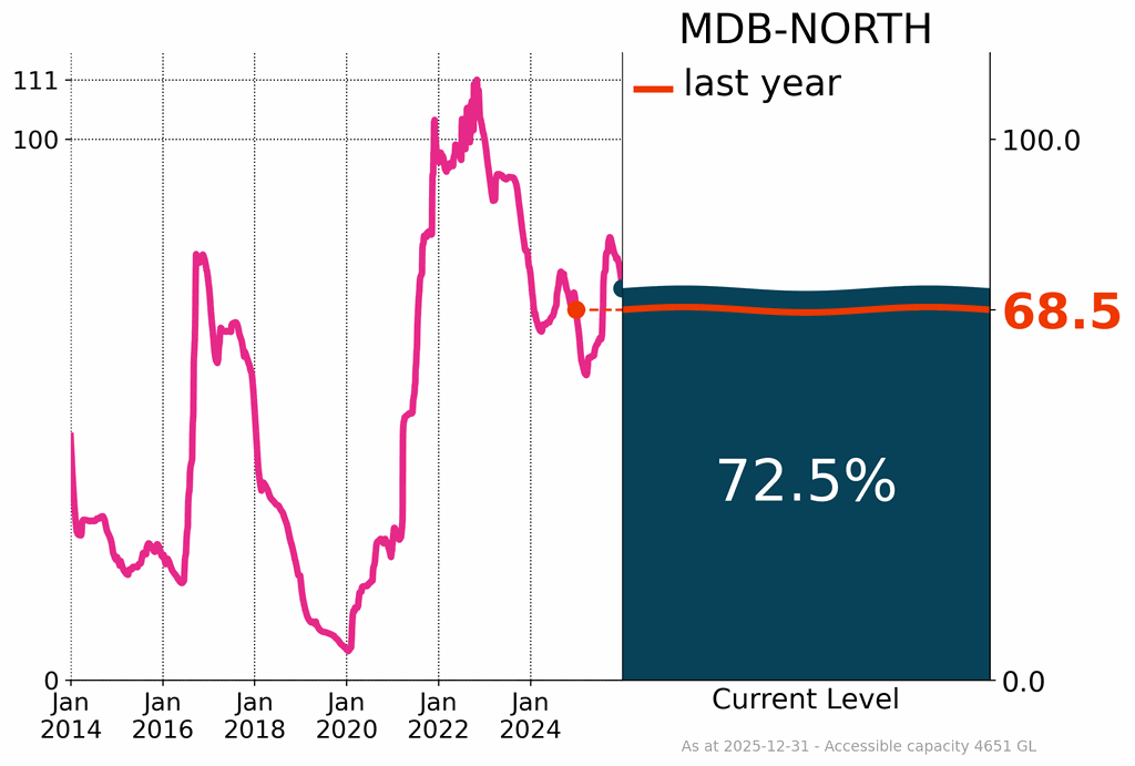 - Surface water storage levels continued to decline across the country, reaching 68% of accessible capacity, a decrease of about 5% over the past year; this included a decline of 14% across the southern Murray–Darling Basin.