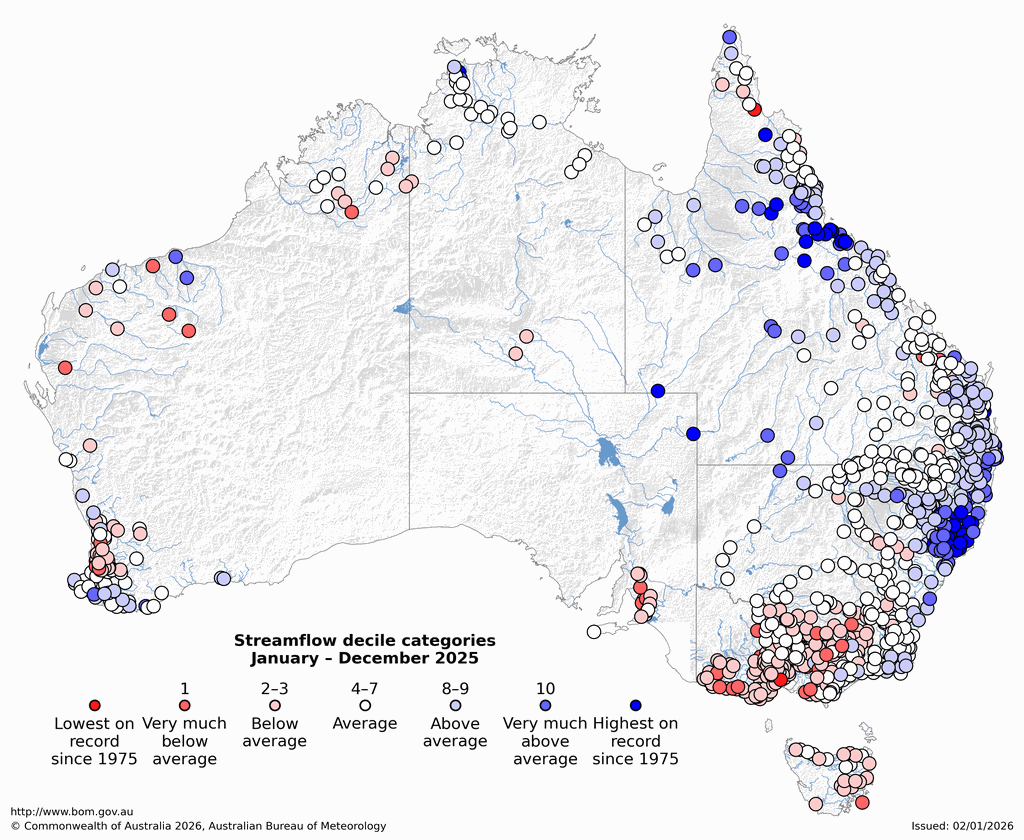 - Streamflow was above average across 33% of sites, mostly across north-eastern New South Wales and parts of northern Queensland, and below average for 29% of sites, across most of south-eastern Australia, including Tasmania.