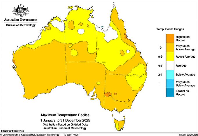 2025 was Australia's fourth-warmest year since national temperature records began in 1910. For Australia as a whole, the national annual average temperature was 1.23 °C above the 1961–1990 average. The annual average temperature for all states and territories, except Tasmania and the Northern Territory, were within their respective top 10 warmest on record.