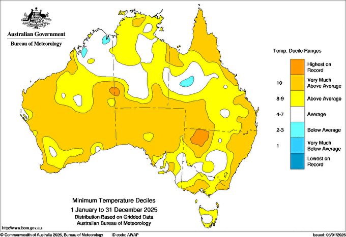 The annual average maximum and minimum temperatures were above to very much above average (in the warmest 10% of all years since 1910) across most of the country. Minimum temperatures were below average for isolated pockets in western Queensland and northern Western Australia.