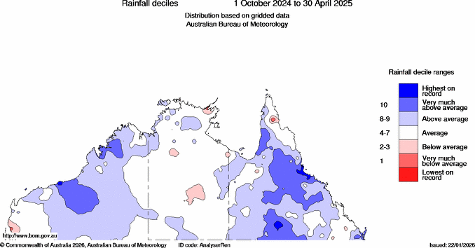 For northern Australia as a whole (north of 26°S, the South Australia and Northern Territory border), rainfall in the 2024–25 wet season (October to April) was 18% above the 1961–1990 average. Rainfall was above to very much above average (in the highest 10% of all wet seasons since 1900–01) for large areas of Queensland and parts of the Kimberley and Pilbara districts in Western Australia. This included small pockets of highest on record wet season rainfall, most notably along the Queensland coast between Townsville and Ingham. Rainfall was average to below average for most of the Northern Territory.
