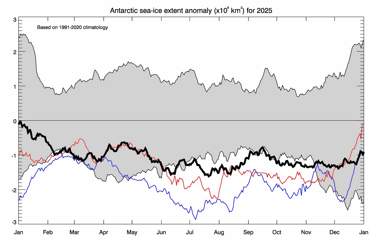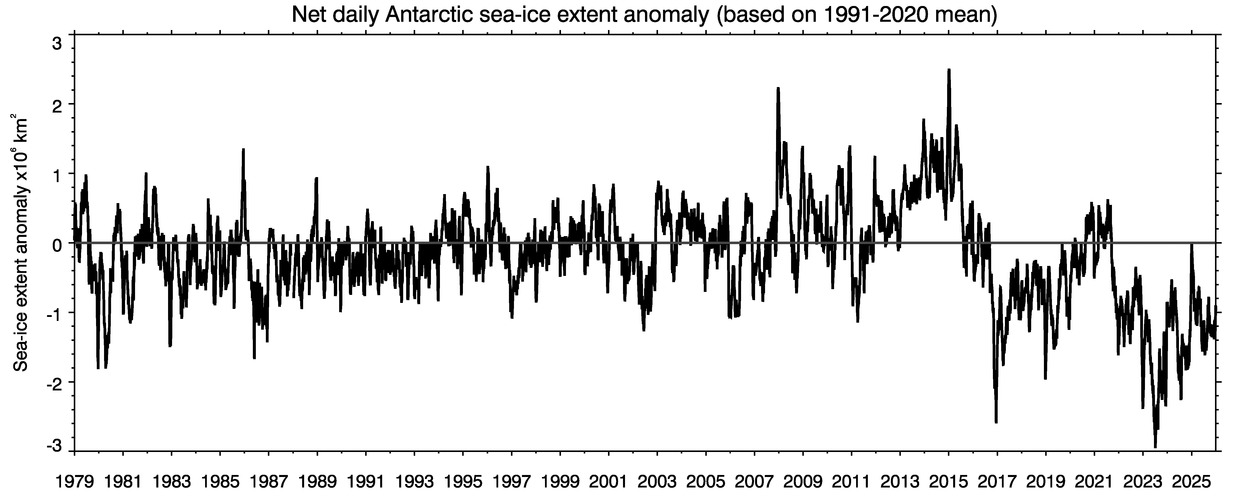 - Antarctic sea ice extent remained below the 1991–2020 average. Summertime daily values were fourth-lowest on record, at 1.96 million km2 on 1 March, and the wintertime daily maximum value was the third-lowest on record, at 17.85 million km2 on 15 September.