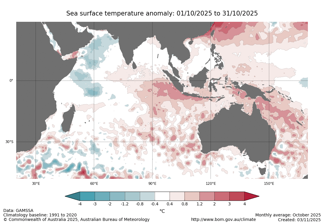 In October, low-intensity to severe heatwave conditions impacted northern, central and eastern parts of Australia and many locations had their warmest October maximum or minimum temperatures on record, including state maximum temperature records in Queensland and New South Wales. For Queensland and the Northern Territory, it was the warmest October on record.
