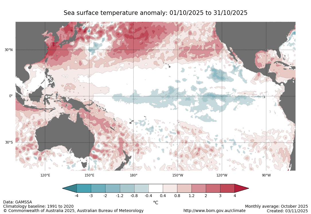 - A weak La Niña developed during summer 2024–25, returning to neutral El Niño-Southern Oscillation (ENSO) conditions in March. A weak La Niña redeveloped in late October, with atmospheric and oceanic conditions fully coupling by October and continuing into 2026.