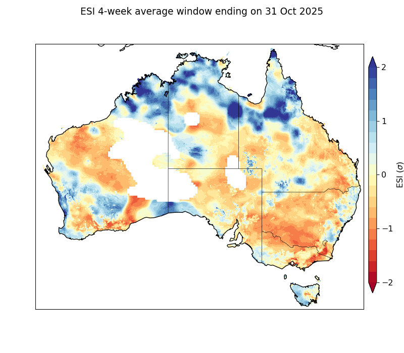 Evaporative stress for the 4 weeks ending 31 October 2025 was elevated (negative Evaporative Stress Index (ESI)) in:
