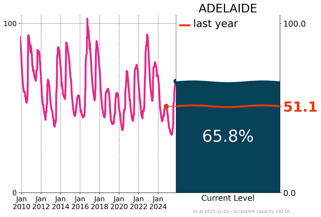 Adelaide’s storages were 65.8% full at the end of October, an increase of 3.0% from the previous month, and 14.5% higher than at the same time last year. Most of the storages in Adelaide remained close to 50% capacity. Adelaide’s urban water supply is augmented by transfers from the River Murray, with additional support from desalination and groundwater. River Murray pipelines also supply water to the Eyre and Yorke Peninsulas and parts of south-east South Australia.