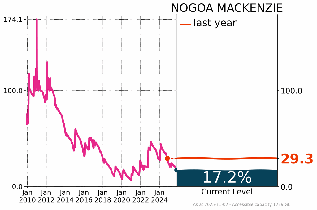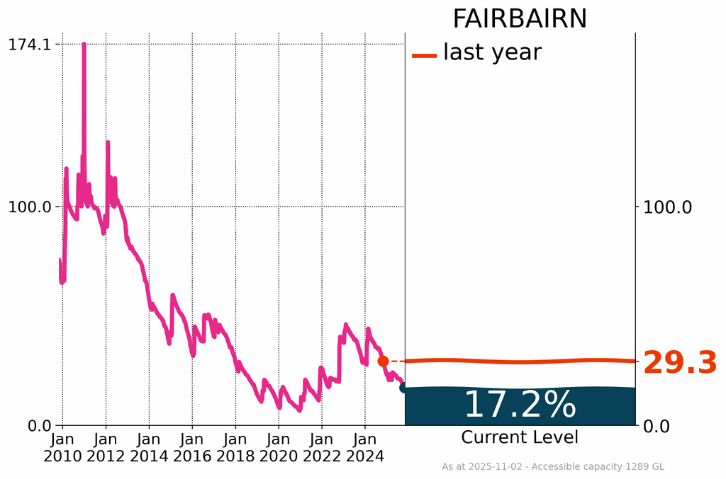 Fairbairn decreased by 1.5%, finishing the month at 17.2%. The decline at Fairbairn contributed to reduced overall volumes in the Nogoa-Mackenzie system (17.2% full) in October, which supplies water to rural communities across central Queensland. Lake Awoonga also decreased by 1.0%, ending October at 30.3%.