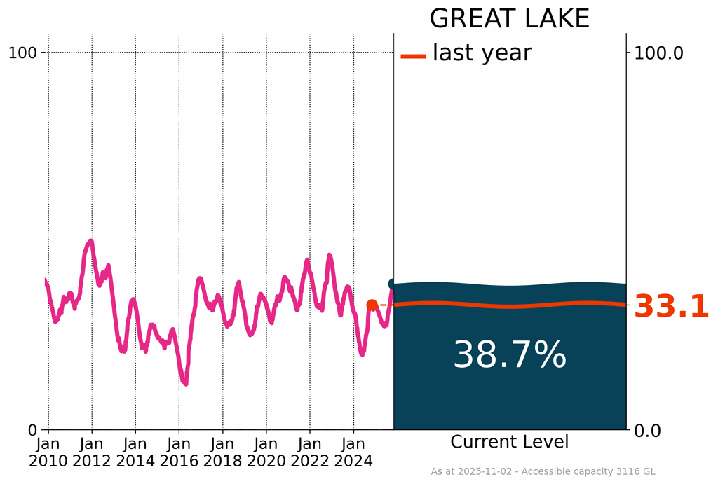 In Tasmania, the two largest storages—Lake Gordon and Great Lake—were at 58.0% and 38.7%, respectively, by the end of October. Total storage across Tasmania was 68.3%, an increase of 2.7% from September, but 2.4% lower than this time last year.