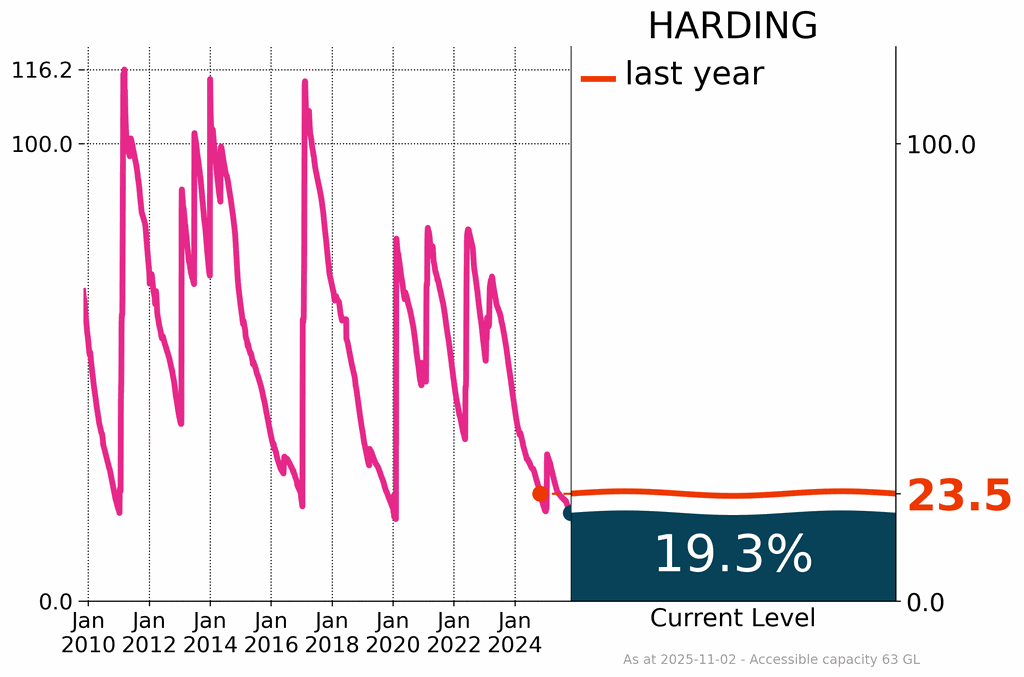 Harding Reservoir, the only major storage in the Pilbara–Gascoyne drainage division, was at 19.3% of capacity at the end of October, a decrease of 1.5% from the previous month, and 4.2% lower than at the same time last year.