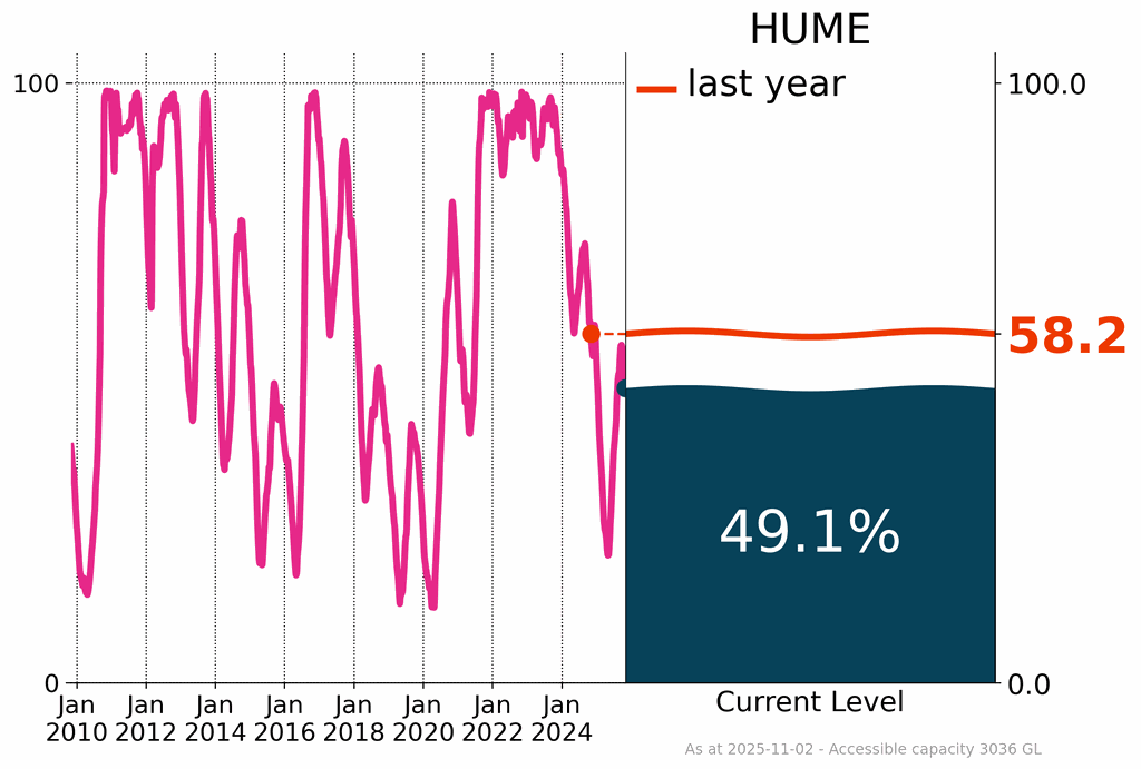 Many storages across the Murray–Darling Basin and South East Coast (Victoria) drainage division were below or close to 50% of capacity by the end of October, including Hume Dam, Australia’s seventh-largest reservoir, and Lake Eucumbene. Hume Dam decreased by 6.7% during October, finishing at 49.1%.