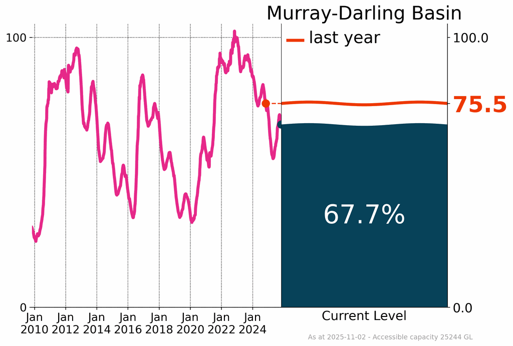 The overall storage volume across the Murray–Darling Basin decreased by 3.2% during October, finishing the month at 67.9% and 8.1% lower than at the same time last year. With dry catchment conditions and increased demand during the irrigation season (October to March), the storage volume decreased across southern Murray–Darling Basin.