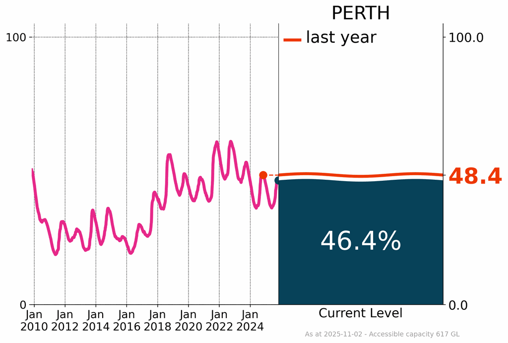 Perth’s surface water storages were 46.4% full at the end of October, an increase of 0.4% from the previous month, but 2.0% down from the same time last year. The two largest storages supplying Perth remained below 40% capacity, with South Dandalup at 10.5% and Serpentine at 33.1%.