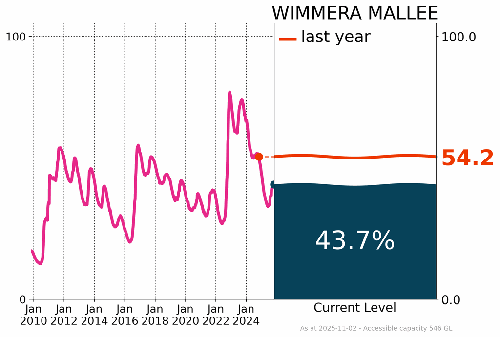 Overall storage volume across the South East Coast (Victoria) drainage division increased by 2.7% in October, ending the month at 45.5%. In the Wimmera–Mallee system, a critical rural water supply for domestic and agricultural use in western Victoria, storages increased by 1.1%, reaching 43.7% by the end of October. However, this was 10.5% lower than at the same time last year.