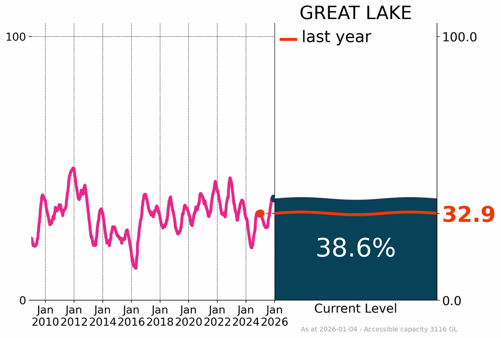 In Tasmania, the two largest storages—Lake Gordon and Great Lake were at 65.0% and 38.6%, respectively, by the end of December. Total storage across Tasmania was 71.0%, an increase of 1.0% from November, and 5.3% higher than this time last year.