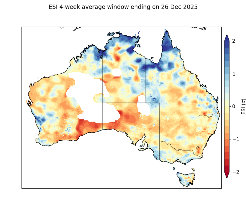 Evaporative stress for the 4 weeks ending 26 December 2025 was elevated (negative Evaporative Stress Index (ESI)) in: