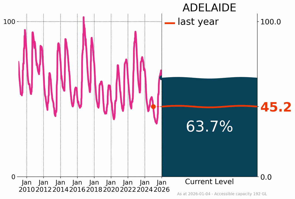 Adelaide’s storages were 63.7% full at the end of December, a decrease of 3.5% from the previous month, and 18.5% higher than at the same time last year. Most of the storages in Adelaide remained above 60% capacity except South Para at 48.8% capacity. Storages rises were driven by operational factors, Murray River inflows and local catchment runoff.