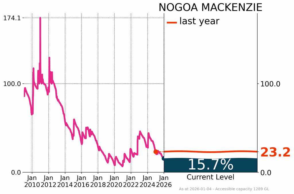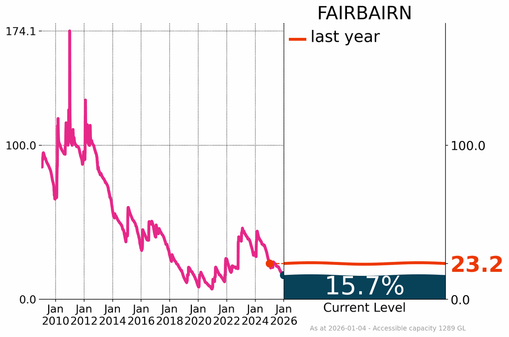 Fairbairn decreased slightly by 1.2%, finishing the month at 15.7%. The decline at Fairbairn contributed to reduced overall volumes in the Nogoa-Mackenzie system which declined to 15.7% of capacity in December. This system supplies water to rural communities across central Queensland. Lake Awoonga had a small increase in December ending at 33.4%, 3.3% higher than at the start of the month.