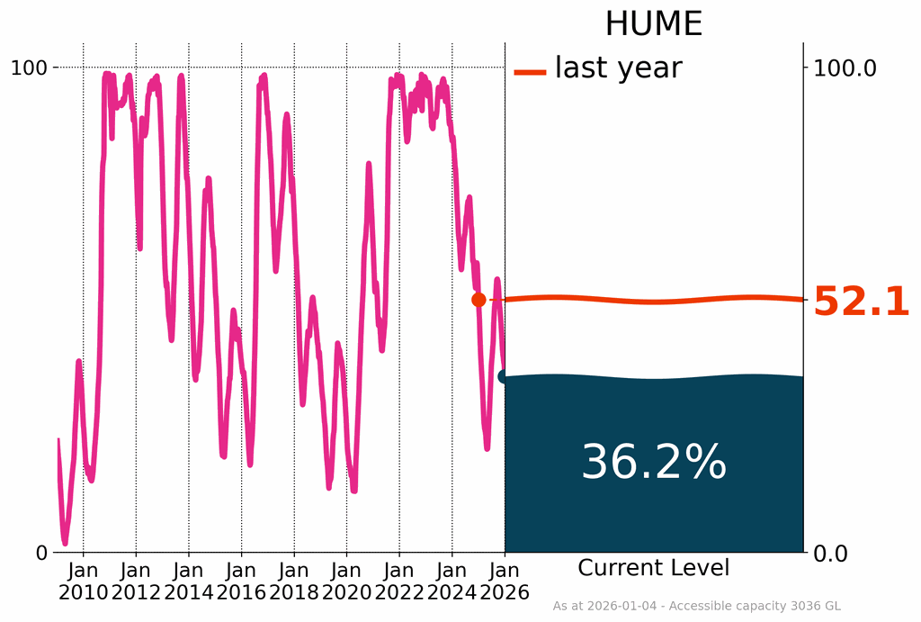 Many storages across the Murray–Darling Basin and the South East Coast (Victoria) drainage division were below or close to 50% of capacity by the end of December, including Hume Dam, Australia’s seventh-largest reservoir, and Lake Eucumbene. Hume Dam decreased by 7.5% during December, finishing at 36.2%, 15.9% lower than at the same time last year.