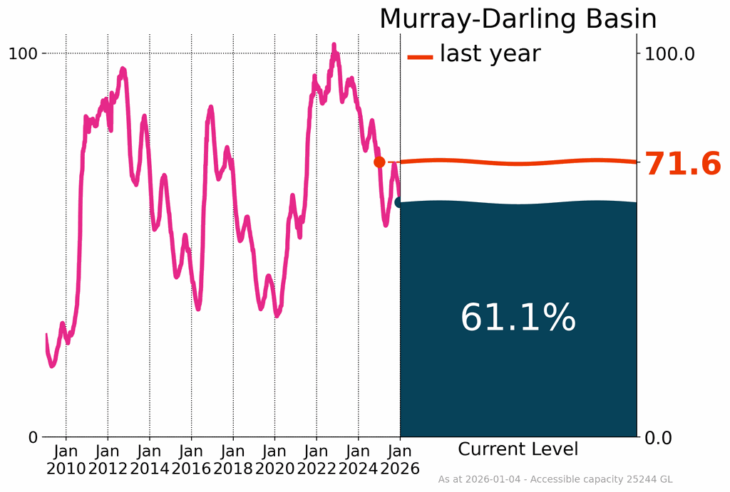 The overall storage volume across the Murray–Darling Basin decreased by 5.1% during December, finishing the month at 61.1% and 10.5% lower than at the same time last year. With dry catchment conditions and increased demand during the irrigation season (October to March), the storage volume decreased in 13 of the 33 storages across southern Murray–Darling Basin.