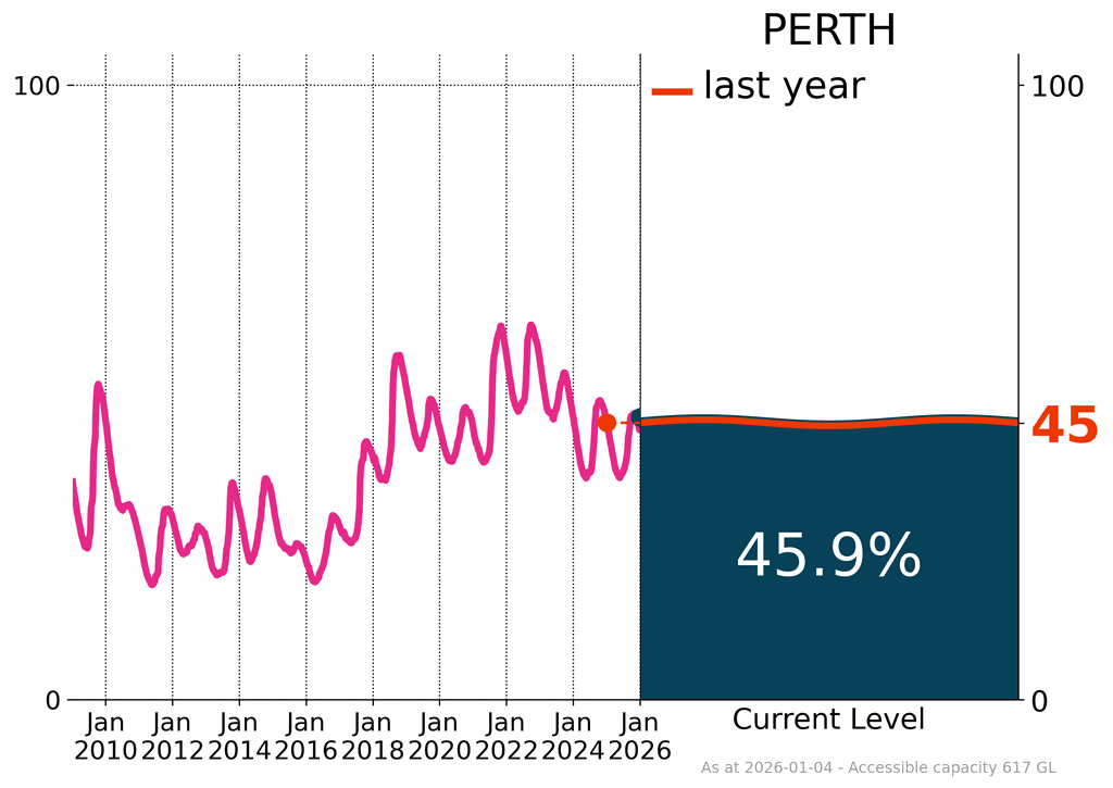 Perth recorded slightly above average rainfall and soil moisture in December. Perth’s surface water storages remained steady at 45.9% of capacity at the end of December, an increase of 0.1% from the previous month, and 0.9% higher than at the same time last year. The two largest storages supplying Perth remained below 40% capacity, with South Dandalup at 9.1% and Serpentine at 33.1%.