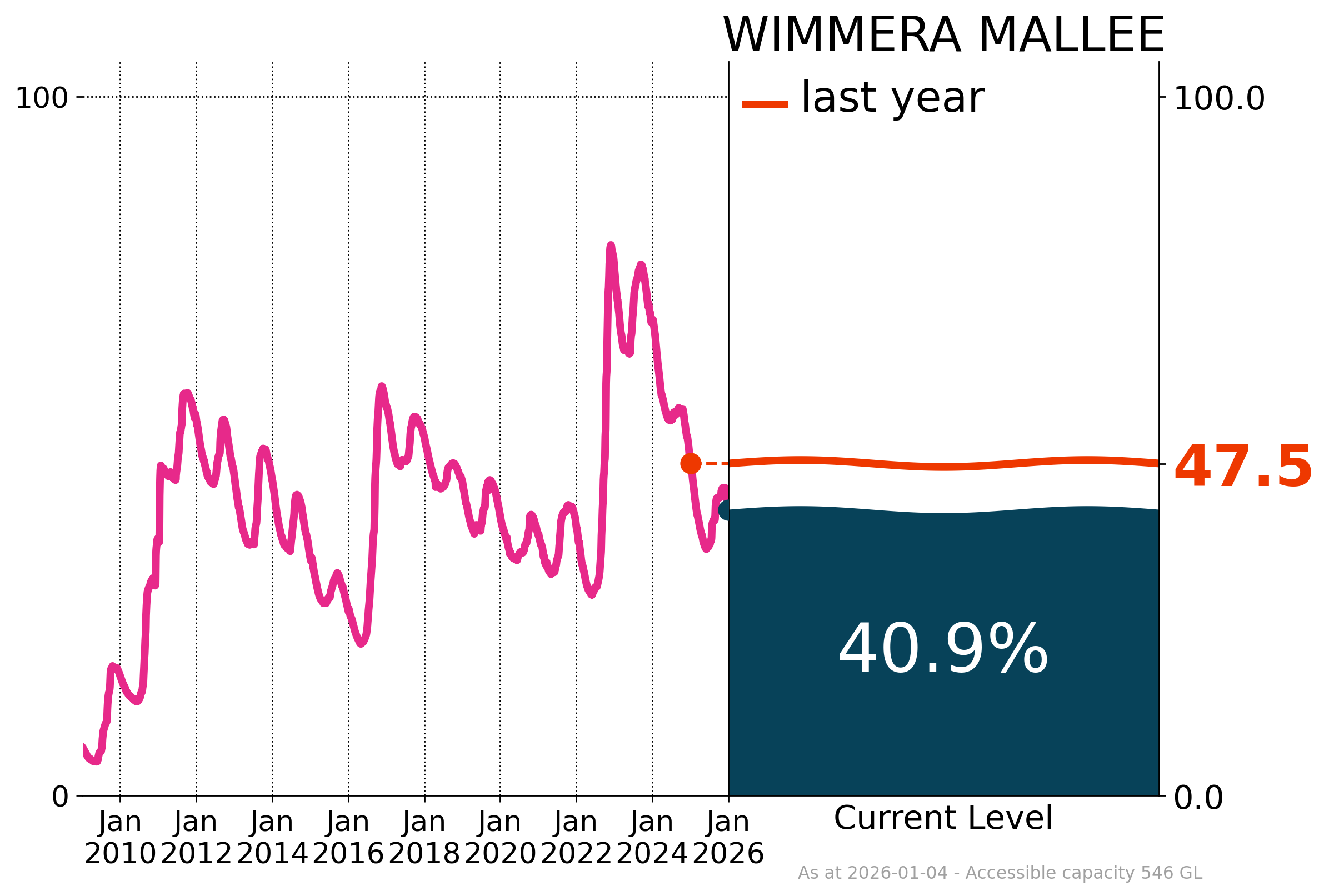 Overall storage volume across the South East Coast (Victoria) drainage division slightly decreased by 0.3% in December, ending the month at 46.5%. In the Wimmera–Mallee system, a critical rural water supply for domestic and agricultural use in western Victoria, storages were at 40.9% of capacity, down by 2.7% compared to the previous month. However, this was 6.6% lower than at the same time last year.